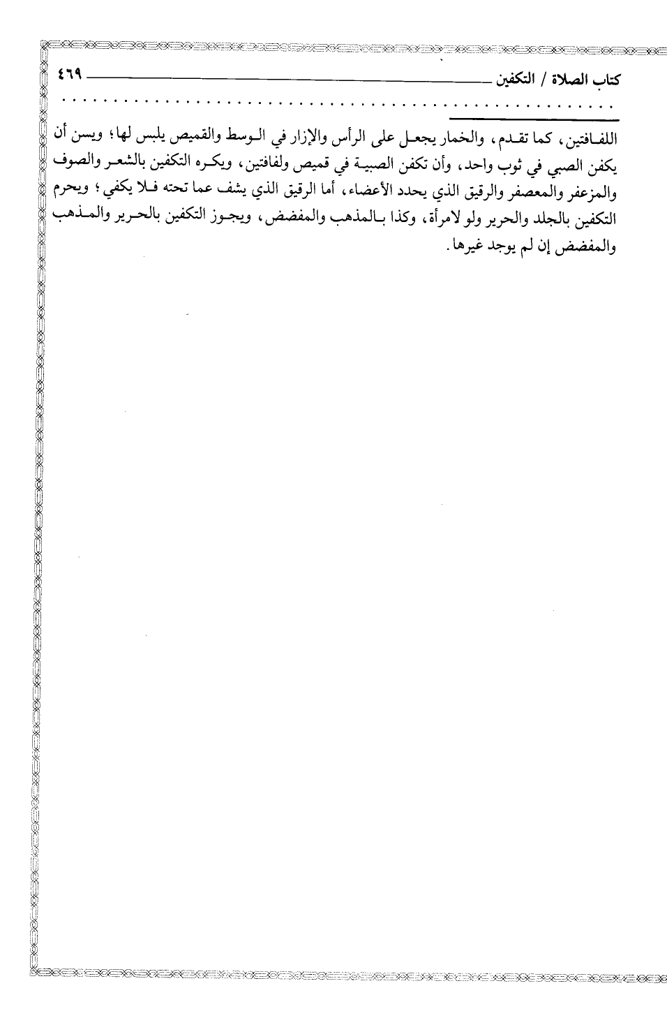 اللفافتين، كما تقدم، والخمار يجعل على الرأس والإزار في الوسط والقميص يلبس لها؛ ويسن أن يكفن الصبي في ثوب واحد، وأن تكفن الصبية في قميص ولفافتين، ويكره التكفين بالشعر والصوف والمزعفر والمعصفر والرقيق الذي يحدد الأعضاء، أما الرقيق الذي يشق عما تحته فلا يكفي؛ ويحرم التكفين بالجلد والحرير ولو لامرأة، وكذا بالمذهب والمفضض، ويجوز التكفين بالحرير والمذهب والمفضض إن لم يوجد غيرها