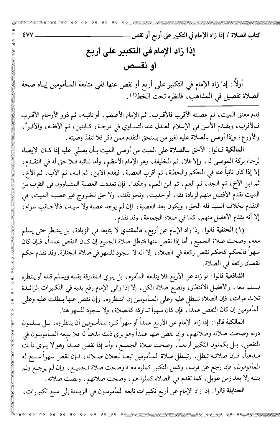 (¬1) الحنفية قالوا: إذا زاد الإمام عن أربع، فالمقتدي لا يتابعه في الزيادة، بل ينتظر حتى يسلم معه، وصحت صلاة الجميع، أما إذا نقص عنها فتبطل صلاة الجميع إن كان النقص عمداً، فإن كان سهواً فالحكم كحم نقص ركعة في الصلاة، إلا أنه لا سجود للسهو في صلاة الجنازة. وقد تقدم حكم نقصان ركعة في الصلاة.