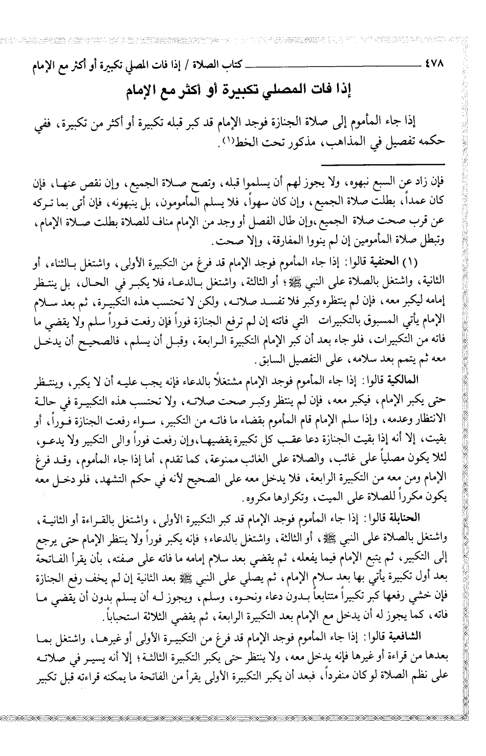 (¬1) الحنفية قالوا: إذا جاء المأموم فوجد الإمام قد فرغ من التكبيرة الأولى، واشتغل بالثناء، أو الثانية، واشتغل بالصلاة على النبي صلى الله عليه وسلم؛ أو الثالثة، واشتغل بالدعاء فلا يكبر في الحال، بل ينتظر إمامه ليكبر معه، فإن لم ينتظره وكبر فلا تفسد صلاته، ولكن لا تحتسب هذه التكبيرة، ثم بعد سلام الإمام يأتي المسبوق بالتكبيرات التي فاتته إن لم ترفع الجنازة فوراً فإن رفعت فوراً سلم ولا يقضي ما فاته من التكبيرات، فلو جاء بعد أن كبر الإمام التكبيرة الرابعة، وقبل أن يسلم، فالصحيح أن يدخل معه ثم يتمم بعد سلامه، على التفصيل السابق.