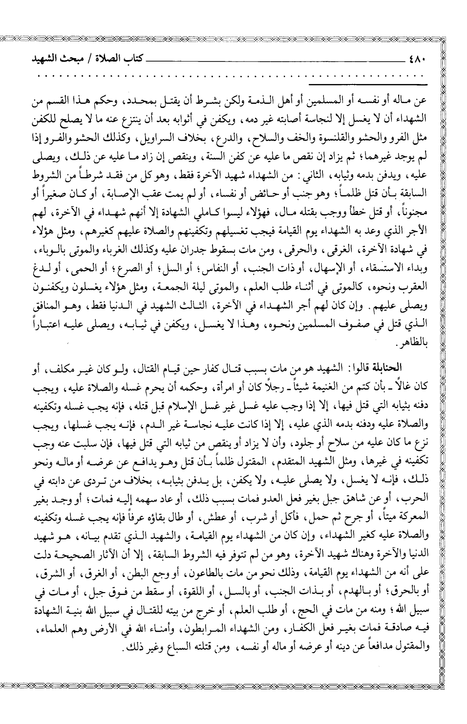 عن ماله أو نفسه أو المسلمين أو أهل الذمة ولكن بشرط أن يقتل بمحدد، وحكم هذا القسم من الشهداء أن لا يغسل إلا لنجاسة أصابته غير دمه، ويكفن في أثوابه بعد أن ينتزع عنه ما لا يصلح للكفن مثل الفرو والحشو والقلنسوة والخف والسلاح، والدرع، بخلاف السراويل، وكذلك الحشو والفرو إذا لم يوجد غيرهما؛ ثم يزاد إن نقص ما عليه عن كفن السنة، وينقص إن زاد ما عليه عن ذلك، ويصلي عليه، ويدفن بدمه وثيابه، الثاني: من الشهداء شهيد الآخرة فقط، وهو كل من فقد شرطاً من الشروط السابقة بأن قتل ظلماً؛ وهو جنب أو حائض أو نفساء، أو لم يمت عقب الإصابة، أو كان صغير أو مجنوناً، أو قتل خطأ ووجب بقتله مال، فهؤلاء ليسوا كاملي الشهادة إلا أنهم شهداء في الآخرة، لهم الأجر الذي وعد به الشهداء يوم القيامة فيجب تغسيلهم وتكفينهم والصلاة عليهم كغيرهم، ومثل هؤلاء في شهادة الآخرة، الغرقى، والحرقى، ومن مات بسقوط جدران عليه وكذلك الغرباء والموتى بالوباء، وبداء الاستسقاء، أو الإسهال، أو ذات الجنب، أو النفاس؛ أو السل؛ أو الصرع؛