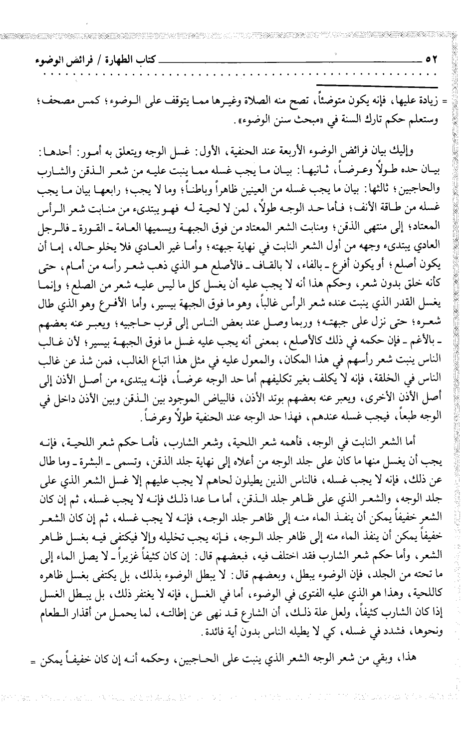 وإليك بيان فرائض الوضوء الأربعة عن الحنفية، الأول: غسل الوجه ويتعلق به أمور: أحدها: بيان حده طولاً وعرضاً، ثانيها: بيان ما يجب غسله مما ينبت عليه من شعر الذقن والشارب والحاجبين؛ ثالثها: بيان ما يجب غسله من العينين ظاهراً وباطناً؛ وما لا يجب؛ رابعها بيان ما يجب غسله من طاقة الأنف؛ فأما حد الوجه طولاً، لمن لا لحية له فهو يبتدئ من منابت شعر الرأس المعتاد؛ إلى منتهى الذقن؛ ومنابت الشعر المعتاد من فوق الجبهة ويسميها العامة - القورة - فالرجل العادي يبتدئ وجهه من أول الشعر النابت في نهاية جبهته؛ وأما غير العادي فلا يخلو حاله، إما أن يكون أصلع؛ أو يكون أفرع - بالفاء، لا بالقاف - فالأصلع هو الذي ذهب شعرَّ رأسه من أمام، حتى كانه خلق بدون شعر، وحكم هذا أنه لا يجب عليه أن يغسل كل ما ليس عليه شعر من الصلع؛ وإنما يغسل القدر الذي ينبت عنده شعر الرأس غالباً، وهو ما فوق الجبهة بيسير، وأما الأفرع وهو الذي طال شعره؛ حتى نزل على جبهته؛ وربما وصل عند بعض الناس إلى قرب حاجبيه؛ ويعبر عنه بعضهم - بالأغم - فإن حكمه في ذلك كالأصلع، بمعنى أنه يجب عليه غسل ما فوق الجبهة بيسير؛ لأن غالب الناس ينبت شعر رأسهم في هذا المكان، والمعول عليه في مثل هذا اتباع الغالب، فمن شذ عن غالب الناس في الخلقة، فإنه لا يكلف بغير تكليفهم أما حد الوجه عرضاً، فإنه يبتدئ من أصل الأذن إلى أصل الأذن الأخرى، ويعبر عنه بعضهم بوتد الأذن، فالبياض الموجود بين الذقن وبين الأذن داخل في الوجه طبعاً، فيجب غسله عندهم، فهذا حد الوجه عند الحنفية طولاً وعرضاً.