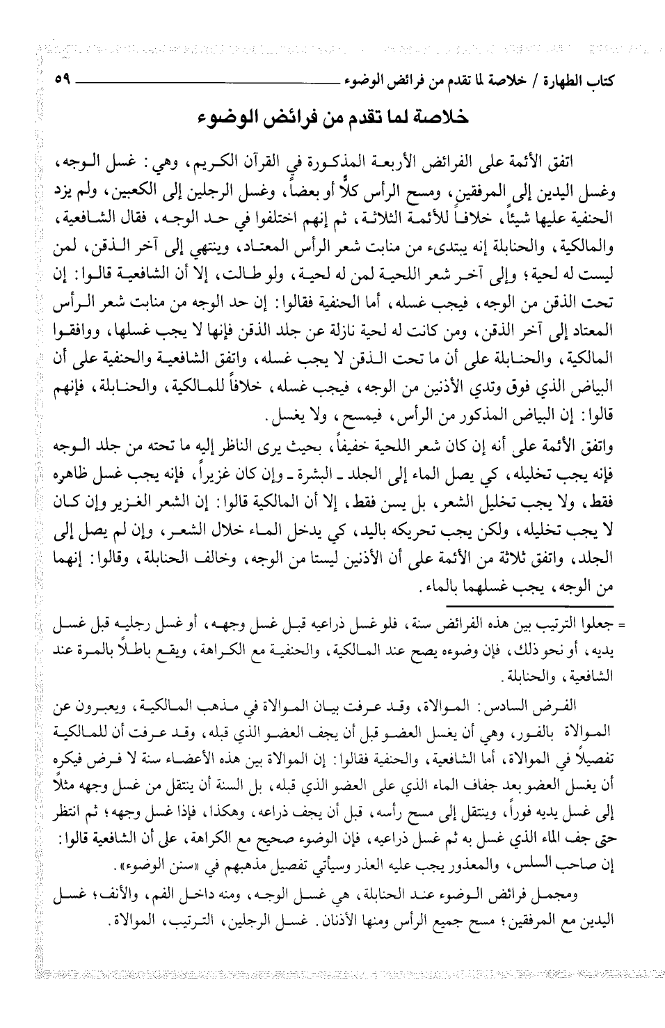 اتفق الأئمة على الفرائض الأربعة المذكورة في القرآن الكريم، وهي غسل الوجه، وغسل اليدين إلى المرفقين، ومسح الرأس كلاًّ أو بعضاً، وغسل الرجلين إلى الكعبين، ولم يزد الحنفية عليها شيئاً، خلافاً للأئمة الثلاثة، ثم إنهم اختلفوا في حد الوجه، فقال الشافعية، والمالكية، والحنابلة إنه يبتدئ من منابت شعر الرأس المعتاد، وينتهي إلى آخر الذقن، لمن ليست له لحية؛ وإلى آخر شعر اللحية لمن له لحية، ولو طالت، إلا أن الشافعية قالوا: إن تحت الذقن من الوجه، فيجب غسله، أما الحنفية قالوا: إن حد الوجه من منابت شعر الرأس المعتاد إلى آخر الذقن، ومن كانت له لحية نازلة عن جلد الذقن فإنه لا يجب غسلها، ووافقوا المالكية، والحنابلة على أن ما تحت الذقن لا يجب غسله، واتفق الشافعية والحنفية على أن البياض الذي فوق وتدي الأذنين من الوجه، فيجب غسله، خلافاً للمالكية، والحنابلة، فإنهم قالوا: إن البياض المذكور من الرأس، فيمسح، ولا يغسل.