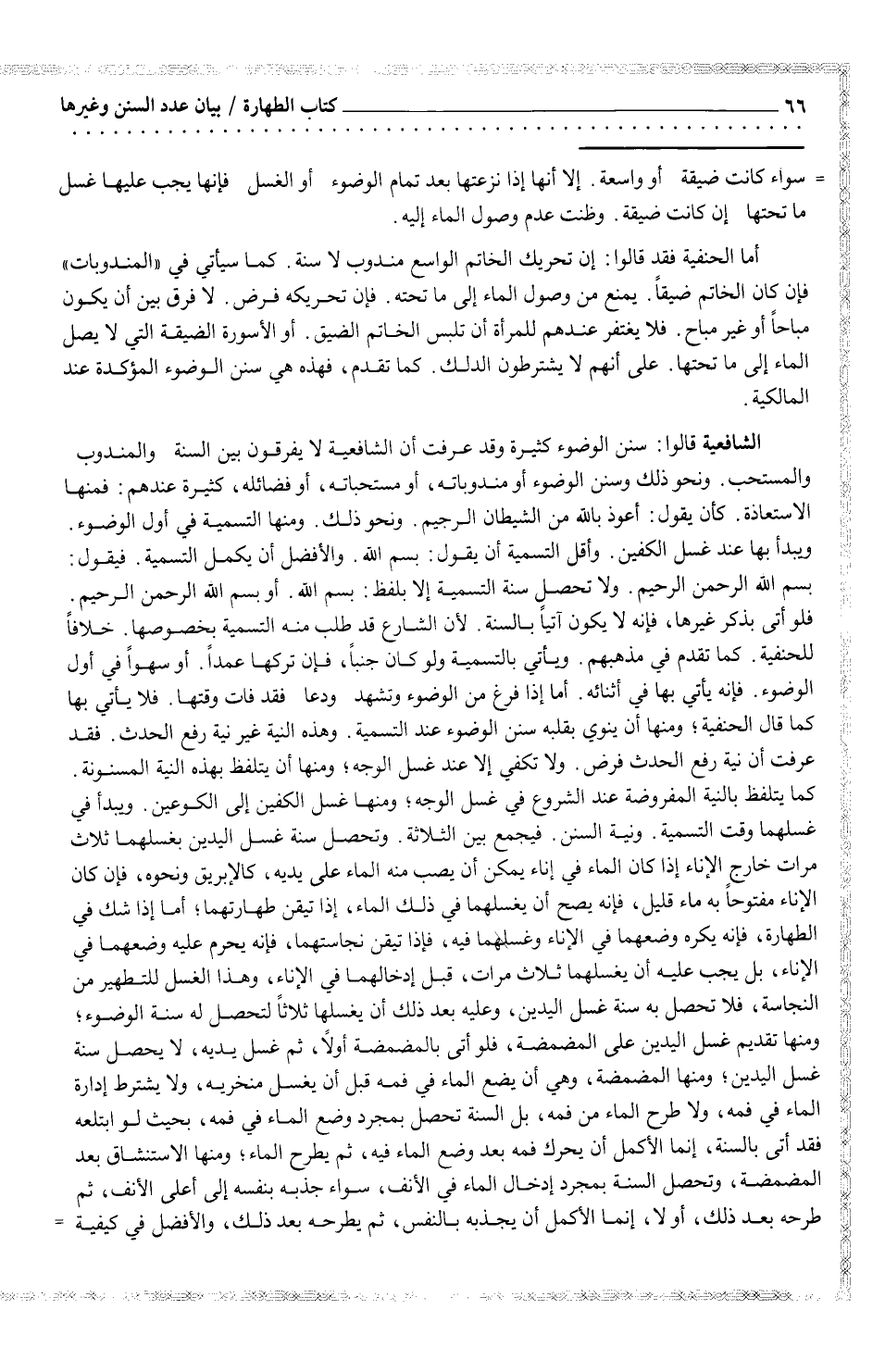 وتحصل سنة غسل اليدين بغسلهما ثلاث مرات خارج الإناء إذا كان الماء في إناء يمكن أن يصب منه الماء على يديه، كالإبريق ونحوه، فإن كان الإناء مفتوحاً به ماء قليل، فإنه يصح أن يغسلهما في ذلك الماء، إذا تيقن طهارتهما؛ أما إذا شك في الطهارة، فإنه يكره وضعهما في الإناء وغسلهما فيه، فإذا تيقن نجاستهما، فإنه يحرم عليه وضعهما في الإناء، بل يجب عليه أن يغسلهما ثلاث مرات، قبل إدخالهما في الإناء، وهذا الغسل للتطهير من النجاسة، فلا تحصل به سنة غسل اليدين، وعليه بعد ذلك أن يغسلها ثلاثاً لتحصل له سنة الوضوء، ومنها تقديم غسل اليدين على المضمضة، فلو أتى بالمضمضة أولاً، ثم غسل يديه، لا يحصل سنة غسل اليدين؛ ومنها المضمضة، وهي أن يضع الماء في فمه قبل أن يغسل منخريه، ولا يشترط إدارة الماء في فمه، ولا طرح الماء من فمه، بل السنة تحصل بمجرد وضع الماء في فمه، بحيث لو ابتلعه فقد أتى بالسنة، إنما الأكمل أن يحرك فمه بعد وضع الماء فيه، ثم يطرح الماء؛ ومنها الاستنشاق بعد المضمضة، وتحصل السنة بمجرد إدخال الماء في الأنف، سواء جذبه بنفسه إلى أعلى الأنف.