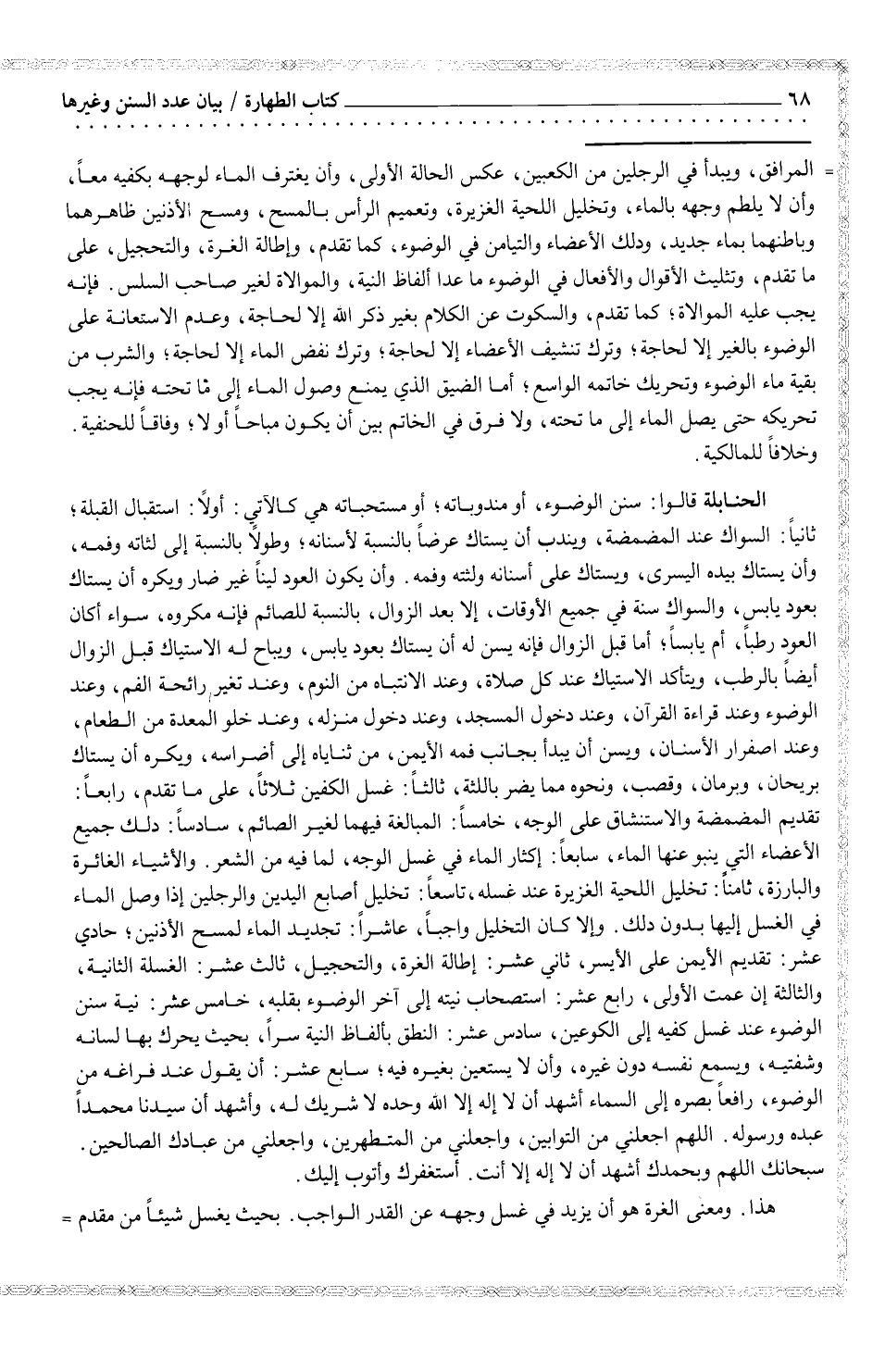 وإلا كان التخليل واجباً، عاشراً: تجديد الماء لمسح الأذنين؛ حادي عشر: تقديم الأيمن على الأيسر، ثاني عشر: إطالة الغرة، والتحجيل، ثالث عشر: الغسلة الثانية، والثالثة إن عمت الأولى، رابع عشر: استصحاب نيته إلى آخر الوضوء بقلبه، خامس عشر: نية سنن الوضوء عند غسل كفيه إلى الكوعين، سادس عشر: النطق بألفاظ النية سراً، بحيث يحرك بها لسانه وشفتيه، ويسمع نفسه دون غيره، وأن لا يستعين بغيره فيه؛ سابع عشر: أن يقول عند فراغه من الوضوء، رافعاً بصره إلى السماء أشهد أن لا إله إلا الله وحده لا شريك له، وأشهد أن سيطنا محمداً عبده ورسوله. اللهم اجعلني من التوابين، واجعلني من المتطهرين، واجعلني من عبادك الصالحين. سبحانك اللهم وبحمدك أشهد أن لا إله إلا أنت. أستغفرك وأتوب إليك.