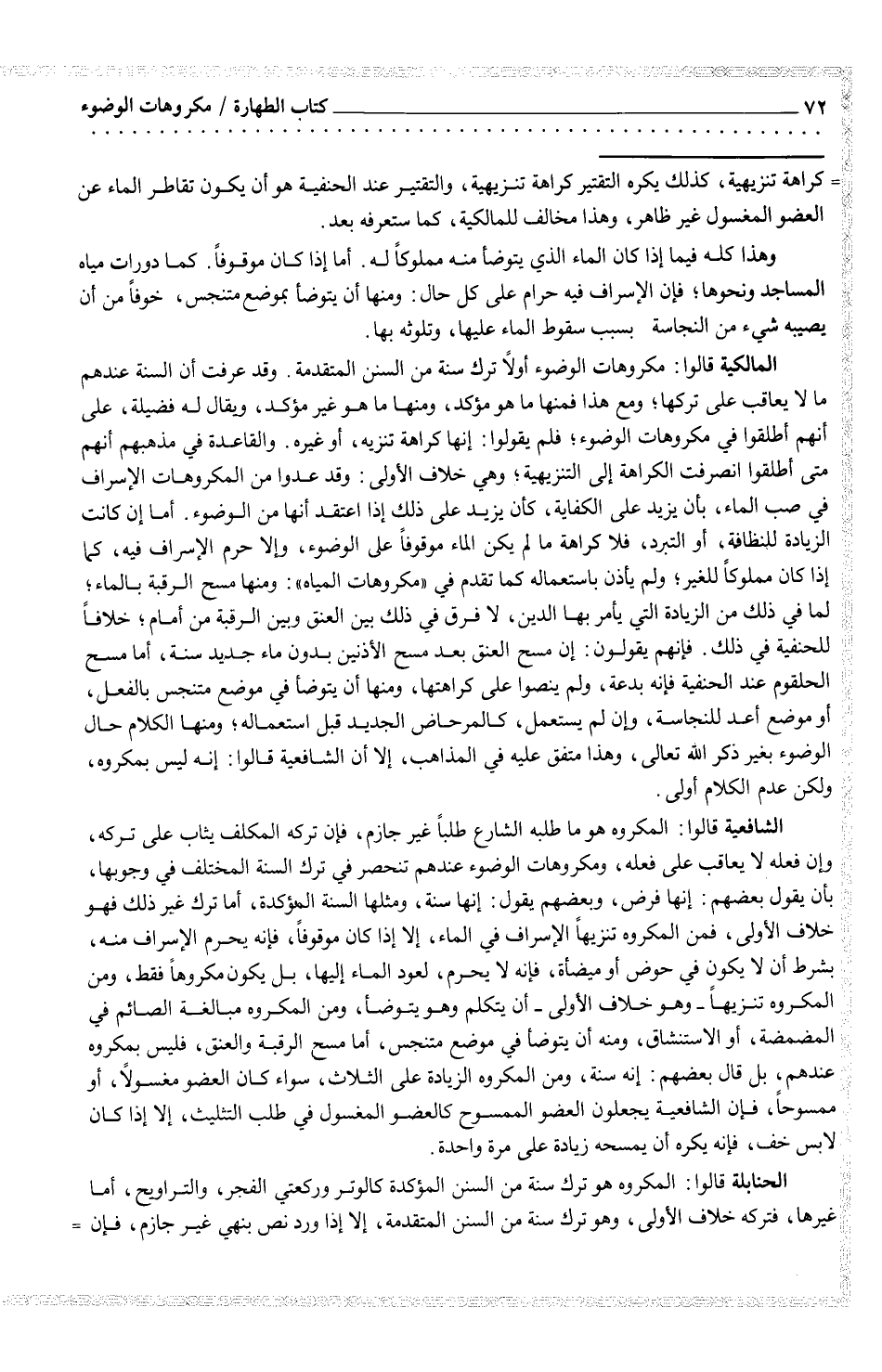 المالكية قالوا: مكروهات الوضوء أولاً ترك سنة من السنن المتقدمة. وقد عرفت أن السنة عندهم ما لا يعاقب على تركها؛ ومع هذا فمنها ما هو مؤكد، ومنها ما هو غير مؤكد، ويقال له فضيلة، على أنهم أطلقوا في مكروهات الوضوء؛ فلم يقولوا: إنها كراهة تنزيه، أو غيره. والقاعدة في مذهبهم أنهم متى أطلقوا انصرفت الكراهة إلى التنزيهية؛ وهي خلاف الأولى: وقد عدوا من المكروهات الإسراف في صب الماء، بأن يزيد على الكفاية، كأن يزيد على ذلك إذا اعتقد أنها من الوضوء. أما إن كانت الزيادة للنظافة، أو التبرد، فلا كراهة ما لم يكن الماء موقوفاً على الوضوء، وإلا حرم الإسراف فيه، كما إذا كان مملوكاً للغير؛ ولم يأذن باستعماله كما تقدم في "مكروهات المياه": ومنها مسح الرقبة بالماء؛ لما في ذلك من الزيادة التي يأمر بها الدين، لا فرق في ذلك بين العنق وبين الرقبة من أمام؛ خلافاً للحنفية في ذلك. فإنهم يقولون: إن مسح العنق بعد مسح الأذنين بدون ماء جديد سنة، أما مسح الحلقوم عند الحنفية فإنه بدعة، ولم ينصوا على كراهتها، ومنها أن يتوضأ في موضع متنجس بالفعل، أو موضع أعد للنجاسة، وإن لم يستعمل، كالمرحاض الجديد قبل استعماله؛ ومنها الكلام حال الوضوء بغير ذكر الله تعالى، وهذا متفق عليه في المذاهب، إلا أن الشافعية قالوا: إنه ليس بمكروه، ولكن عدم الكلام أولى.