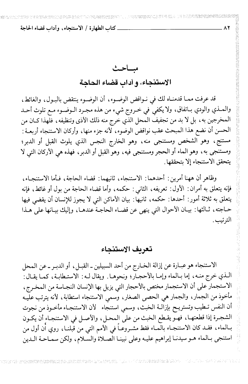 وظاهر أن ههنا أمرين: أحدهما: الاستنجاء، ثانيهما: قضاء الحاجة، فأما الاستنجاء، فإنه يتعلق به أمران: الأول: تعريفه، الثاني: حكمه، وأما قضاء الحاجة من بول أو غائط، فإنه يتعلق به ثلاثة أمور: أحدها: حكمه، ثانيها: بيان الأماكن التي لا يجوز للإنسان أن يقضي فيها حاجته، ثالثها: بيان الأحوال التي ينهى عن قضاء الحاجة عندها، وإليك بيانها على هذا الترتيب.