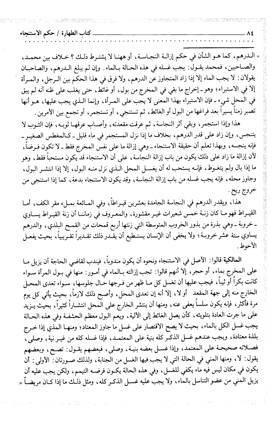 الدرهم، كما هو الشأن في حكم إزالة النجاسة، أو ههنا لا يشترط ذلك؟ خلاف بين محمد والصاحبين، فمحمد يقول: يجب غسله في هذه الحالة بالماء. وإن لم يبلغ الدرهم، والصاحبان يقولان: لا يجب الماء إلا إذا زاد المتجاوز عن الدرهم، ولا فرق في هذا الحكم بين الرجل، والمرأة إلا في الاستبراء؛ وهو - إخراج ما بقي في المخرج من بول، أو غائط، حتى غلب على ظنه أنه لم يبق في المحل شيء - فإن الاستبراء بهذا المعنى لا يجب على المرأة، وإنما الذي يجب عليها، هو أنها تصبر زمناً يسيراً بعد فراغها من البول أو الغائط، ثم تستنجي، أو تستجمر، أو تجمع بين الأمرين.