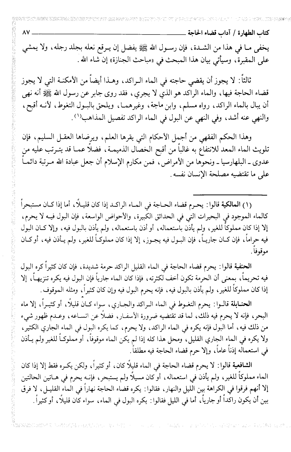 ثالثاً: لا يجوز أن يقضي حاجته في الماء الراكد، وهذا أيضاً من الأمكنة التي لا يجوز قضاء الحاجة فيها، والماء الراكد هو الذي يجري، فقد روى جابر عن رسول الله صلى الله عليه وسلم أنه نهى أن يبال بالماء الراكد، رواه مسلم، وابن ماجة، وغيرهما، ويلحق بالبول التغوط، لأنه أقبح، والنهي عنه أشد، وفي النهي عن البول في الماء الراكد تفصيل المذاهب (¬1)