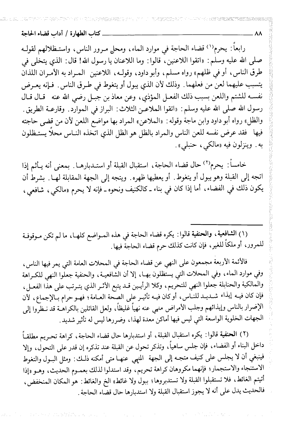 رابعاً: يحرم (¬1) قضاء الحاجة في موارد الماء، ومحل مرور الناس، واستظلالهم لقوله صلى الله عليه وسلم: "اتقوا اللاعنين، قالوا: وما اللاعنان يا رسول الله! قال: الذي يتخلى في طرق الناس، أو في ظلهم" رواه مسلم، وأبو داود، وقوله، اللاعنين المراد به الأمران اللذان يتسبب عليهما لعن من فعلهما. وذلك لأن الذي يبول أو يتغوط في طرق الناس. فإنه يعرض نفسه للشتم واللعن بسبب ذلك الفعل المؤذي، وعن معاذ بن جبل رضي الله عنه قال قال رسول الله صلى الله عليه وسلم: "اتقوا الملاعن الثلاث: البراز في الوارد. وقارعة الطريق. والظل" رواه أبو داود وبان ماجة وقوله: "الملاعن" المراد بها مواضع اللعن لأن من قضى حاجته فيها فقد عرض نفسه للعن الناس والمراد بالظل هو الظل الذي اتخذه الناس محلاً يستظلون به. وينزلون فيه "مالكي، حنبلي".