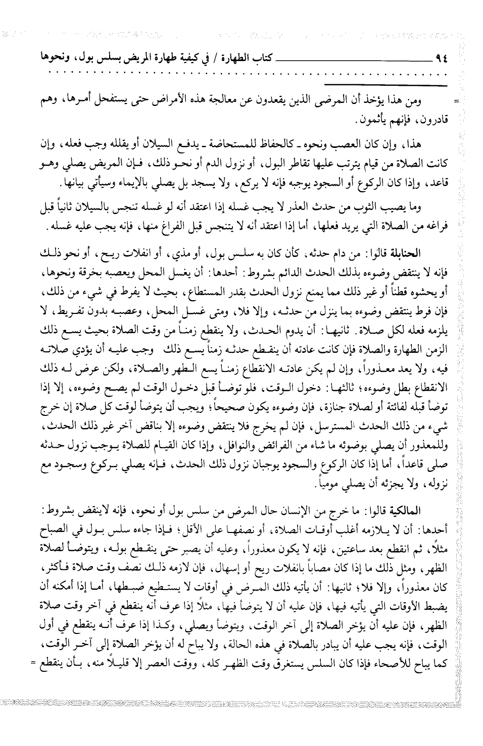 المالكية قالوا: ما خرج من الإنسان حال المرض من سلس بول أو نحوه، فإنه لا ينقض بشروط أحدها: أن لا يلازمه أغلب أوقات الصلاة، أو نصفها على الأقل؛ فإذا جاءه سلس بول في الصاج مثلاً، ثم انقطع بعد ساعتين، فإنه لا يكون معذوراً، وعليه أن يصبر حتى ينقطع بوله، ويتوضأ لصلاة الظهر، ومثل ذلك ما إذا كان مصاباً بانفلات ريح أو إسهال، فإن لازمه ذلك نصف وقت صلاة فأكثر، كان معذوراً، وإلا فلا؛ ثانيها: أن يأتيه ذلك المرض في أوقات لا يستطيع ضبطها، أما إذا أمكنه أن يضبط الأوقات التي يأتيه فيها، فإن عليه أن لا يتوضأ فيها، مثلاً إذا عرف أنه ينقطع في آخر وقت صلاة الظهر، فإن عليه أن يؤخر الصلاة إلى آخر الوقت. ويتوضأ ويصلي، وكذا إذا عرف أنه ينقطع في أول الوقت، فإنه يجب عليه أن يبادر بالصلاة في هذه الحالة، ولا يباح له أن يؤخر الصلاة إلى آخر الوقت، كما يباح للأصحاء فإذا كان السلس يستغرق وقت الظهر كله، ووقت العصر إلا قليلاً منه، بأن ينقطع