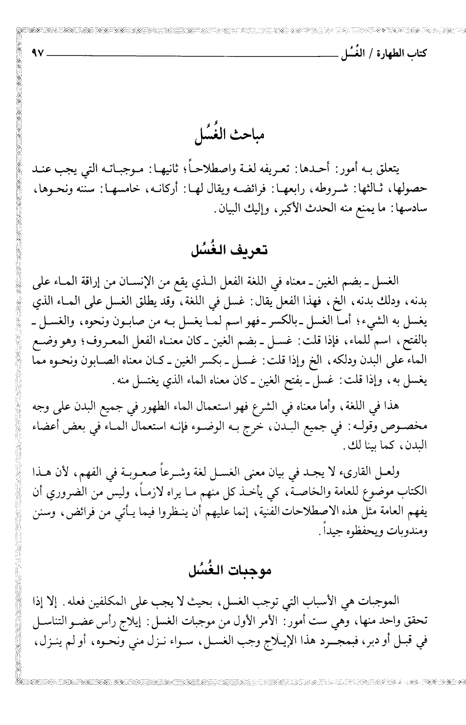 ولعل القارئ لا يجد في بيان معنى الغسل لغة وشرعاً صعوبة في الفهم، لأن هذا الكتاب موضوع للعامة والخاصة، كي يأخذ كل منهم ما يراه لازماً، وليس من الضروري أن يفهم العامة مثل هذه الاصطلاحات الفنية، إنما عليهم أن ينظروا فيما يأتي من فرائض، وسنن ومندوبات ويحفظوه جيداً.
