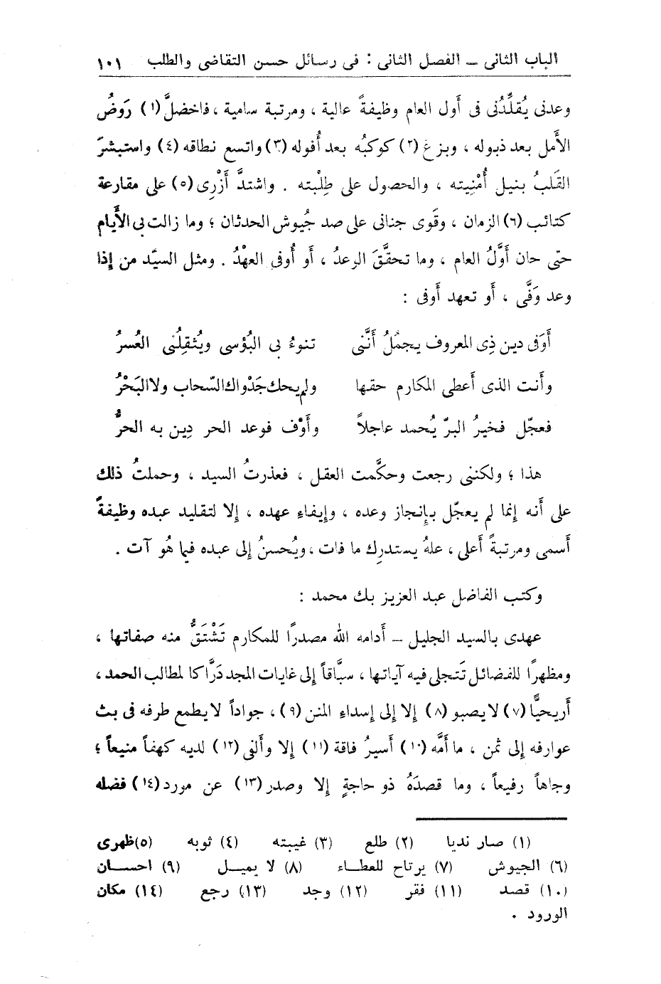 عهدي بالسيد الجليل أدامه الله مصدراً للمكارم تستق منه صفاتها ومظهراً للفضائل تتجلى فيه آياتها سباقاً إلى غايات المجد درا كالمطلب الحمد أريحيا لا يصبو إلا إلى إسداء المنن جواداً لايطمع طرفه في بث عوارفه إلى ثمن ما أمه أسير فاقة إلا وألفى لديه كهفاً منيعاً وجاهاً رفيعاً قصده ذو حاجة إلا وصدر عن مورد فضله