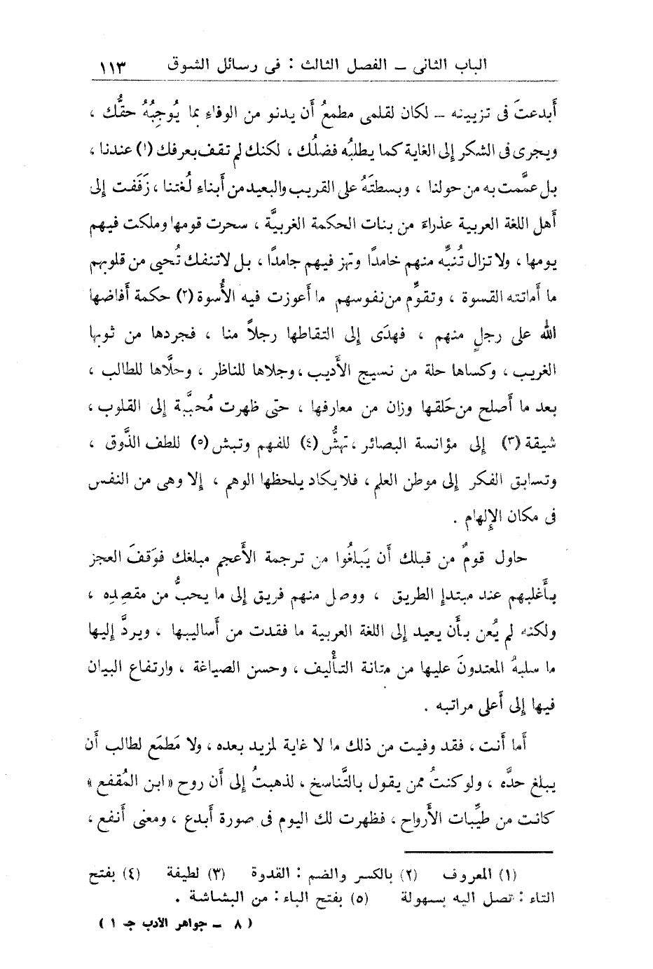 حاول قوم من قبلك أن يبلغوا من ترجمة الأعجم مبلغك فوقف العجز بأغلبهم عند مبتدأ الطريق ووصل منهم فريق إلى ما يحب من مقصده ولكنه لم يعن بأن يعيد إلى اللغة العربية ما فقدت من أساليبها ويرد ما سلبه المعتدون عليها من متانة التأليف وحسن الصياغة وارتفاع البيان فيها إلى أعلى مراتبه: أما أنت فقد وفيت من ذلك ما لا غاية لمريد بعده ولا مطمع لطالب أن يبلغ حده، ولو كنت ممن يقول بالتناسخ لذهبت إلى أن روح "ابن المقفع" كانت من طيبات الأرواح، فظهرت لك اليوم في صورة أبدع ومعنى أنفع ولعلك قد سننت بطريقتك في التعريب سنة يعمل عليها من يحاوله بعد ظهور