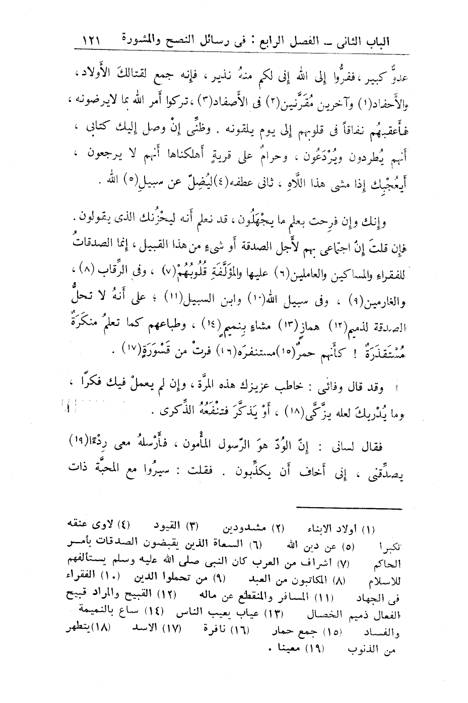 عليه يلهث على أنه لكم عدو كبير ففروا إلى الله إني لكم منه نذير فإنه جمع لقتالك الأولاد والأحفاد وآخرين مقرنين في الأصفاد تركوا أمر الله واشتغلوا بما يرضونه فأعقبهم نفاقاً في قلوبهم إلى يوم يلقونه: وطني أن وصل إليك كتابي أنهم يطرون ويردعون (وَحَرَامٌ عَلَىَ قَرْيَةٍ أَهْلَكْنَاهَآ أَنّهُمْ لاَ يَرْجِعُونَ) [الأنبياء: 95] أيعجبك إذا مشى هذا اللاه ثاني عطفه (لِيُضِلّ عَن سَبِيلِ اللهِ) [القمان: 6] وإنك وإن فرحت بعلم ما يجهلون قد نعلم إنه لحزنك الذي يقولون: فإن قلت إن اجتماعي بهم لأجل الصدقة أو شيء من هذا القبيل (إِنّمَا الصّدَقَاتُ لِلْفُقَرَآءِ وَالْمَسَاكِينِ وَالْعَامِلِينَ عَلَيْهَا وَالْمُؤَلّفَةِ قُلُوبُهُمْ وَفِي الرّقَابِ وَالْغَارِمِينَ وَفِي سَبِيلِ اللهِ وَابْنِ السّبِيلِ) [التوبة: 60] على أنه لا تحل الصدقة لذميم (هَمّازٍ مّشّآءِ بِنَمِيمٍ) [القلم: 11] وطباعهم كما تعلم منكرة مستقذرة (كَأَنّهُمْ حُمُرٌ مّسْتَنفِرَةٌ فَرّتْ مِن قَسْوَرَةٍ) [المدثر: 50 51] وقد قال (وفائي) خاطب عزيزك هذه المرة وإن لم يعمل فيك فكرا (وَمَا يُدْرِيكَ لَعَلّهُ يَزّكّىَ أَوْ يَذّكّرُ فَتَنفَعَهُ الذّكْرَىَ) [عبس: 3 4] فقال (لساني) إن الود هو الرسول المأمون (فَأَرْسِلْهِ مَعِيَ رِدْءاً يُصَدّقُنِي إِنّيَ أَخَافُ أَن يُكَذّبُونِ) [القصص: 34] فقلت سيروا مع المحبة ذات