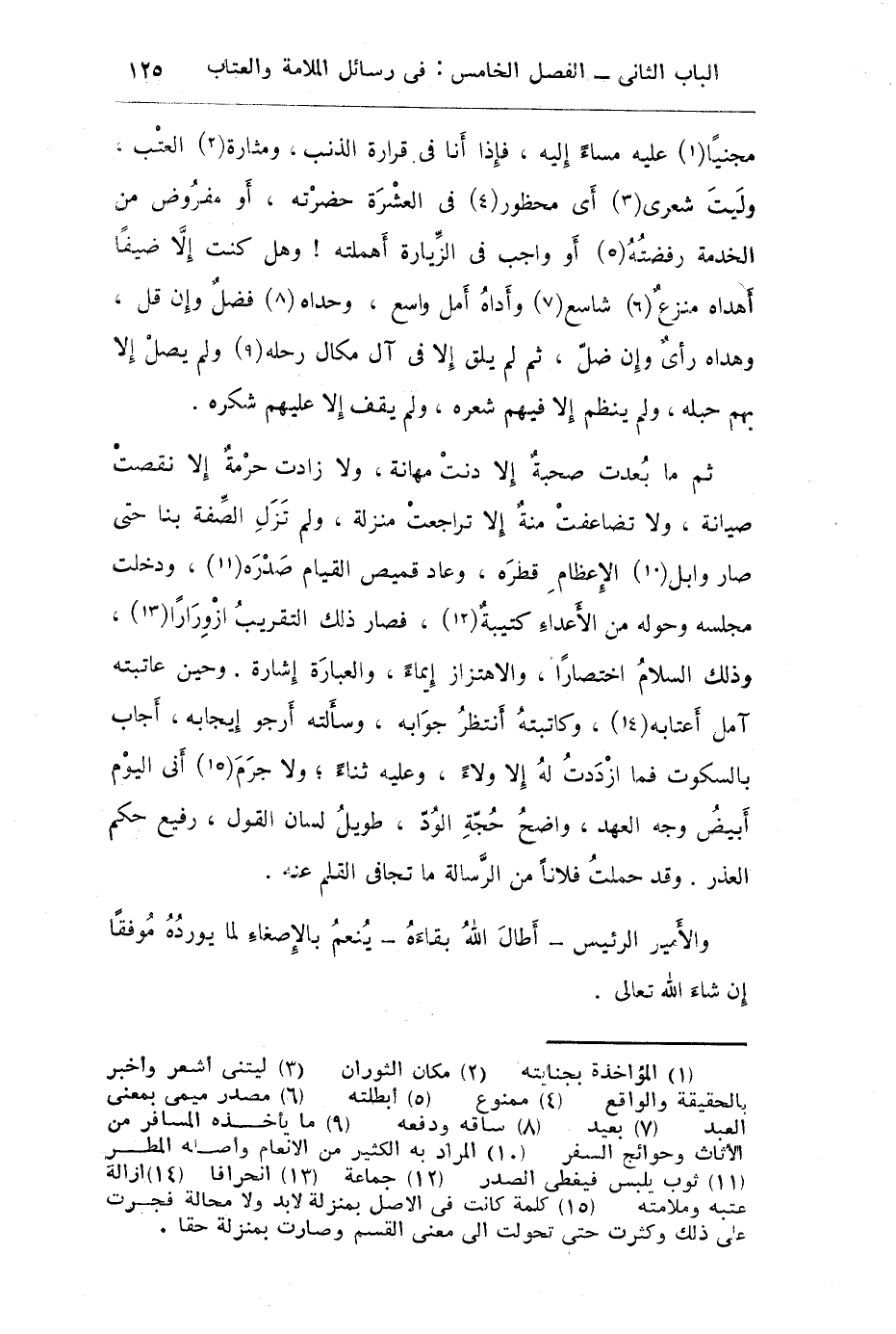 معجباً عليه مساء إليه فإذا أنا في قرارة الذنب ومثارة العتب وليت شعري أي محظور في العشرة حضرته أو مفروض من الخدمة رفضته أو واجب في الزيارة أهملته وهل كنت إلا ضيفاً أهداه منزع شاسع وأداه أمل واسع وحداه فضل وإن قل وهداه رأي وإن ضل ثم لم يلق إلا في آل ميكال رحله ولم يصل إلا بهم حبله ولم ينظم إلا فيهم شعره ولم يقف إلا عليهم شكره: ثم ما بعدت صحبة إلا دنت مهانة ولا زادت مرمة إلا نقصت صيانة ولا تضاعفت منة إلا تراجعت منزلة ولم تزل الصفة بنا حتى صار وابل الأعظام قطرة وعاد قميص القيام صدره ودخلت مجلسه وحوله من الأعداء كتيبه فصار ذلك التقريب ازورارا وذلك السلام اختصاراً والاهتزاز إيماء والعبارة إشارة وحين عاتبته آمل إعتابه وكاتبته أنتظر جوابه وسألته أرجو إيجابه أجاب بالسكوت فما ازددت له إلا ولاء وعليه ثناء ولا جرم إني اليوم أبيض وجه العهد واضح حجة الود طويل لسان القول رفيع حكم العذر وقد حملت فلاناً من الرسالة ما تجافى القلم عنه والأمير الرئيس أطال الله بقاءه ينعم بالإصغاء لما يورده موفقاً إن شاء الله عز وجل.