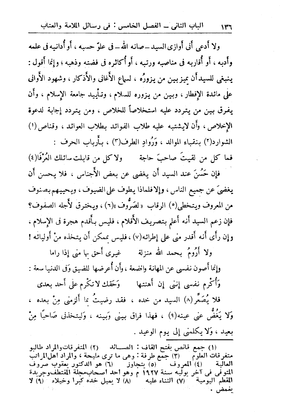 ولا أدعي أني أوازي السيد صانه الله في علو حسبه أو أدانيه في علمه وأدبه أو أقاربه في مناصبه ورتبه أو أكاثره في فضته وذهبه وإنما أقول ينبغي للسيد أن يميز بين من يزوره لسماع الأغاني والأذكار وشهود الأواني على مائدة الإفطار وبين من يزوره للسلام وتأييد جامعة الإسلام وأن يفرق بين من يتردد عليه استخلاصاً للخلاص ومن يتردد إجابة لدعوة الإخلاص وأن لا يشتبه عليه طلاب الفوائد بطلاب العوائد وقناص الشوارد بنقاء الموالد ورواد الطرف بأرباب الحرف.