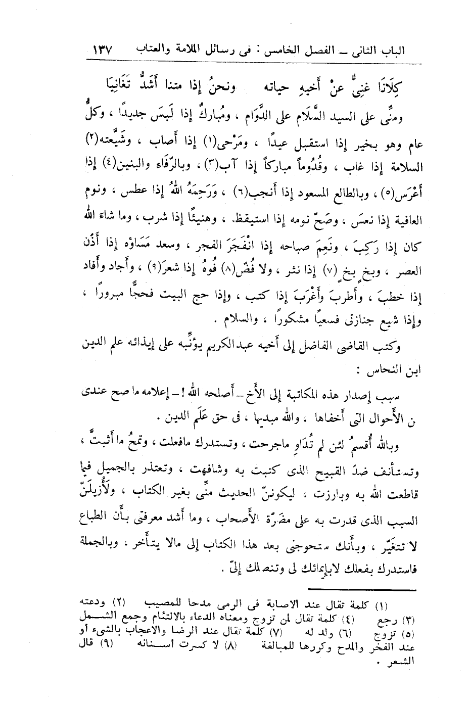 ومن يعلى السيد السلام على الدوام ومبارك إذا لبس جديداً وكل عام وهو بخير إذا استقبل عيداً ومرحى إذا أصاب وشيعته السلامة إذا غاب وقدوماً مباركاً إذا آب وبالرفاء والبنين إذا أعرس وبالطالع المسعود إذا أنجب ورحمه الله إذا عطس ونوم العافية إذا نعس وصح نومه إذا استيقظ وهنيئاً إذا شرب وما شاء الله كان إذا ركب ونعم صاحبه إذا انفجر الفجر وسعد مساؤه إذا أذن العصر وبخ بخ إذا نثر ولا فض فوه إذا شعر وأجاد وأفاد إذا خطب وأطرب واغرب إذا كتب وإذا حج البيت فحجاً مبروراً وإذا شيع جنازتي فسعياً مشكوراً: والسلام.