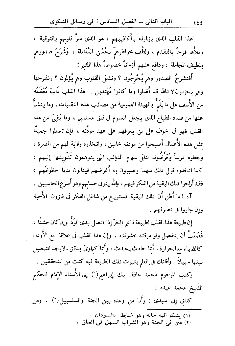 "وكتب حافظ بك ابراهيم إلى الأستاذ الإمام الحكيم الشيخ محمد عبده"