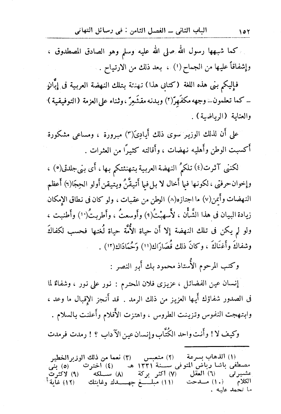 فإليكم بني هذه اللغة كتابي هذا تهنئة بتلك النهضة العربية في إبان كما تعلمون وجهه مكفهر وبدنه مقشعر وثناء على العناية التوفيقية والعزمة الرباضية.