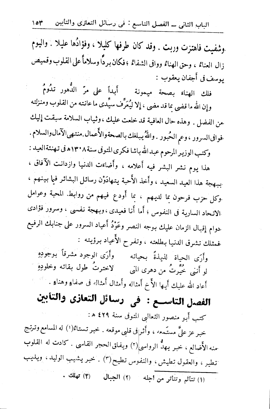 هذا يوم نشر البشر فيه أعلامه وأضاءت الدنيا وازدانت الآفاق ببهجة هذا العيد السعيد وأخذ الأحبة يتهادون رسائل البشائر فيما بينهم وكل حزب فرحون بما لديهم بما أودع فيهم من روابط المحبة وعوامل الاتحاد السارية في النفوس: أما أنا فعيدي وبهجة نفسي وسرور فؤادي دوام إقبال الزمان عليك بوجه النصر وعود أعياد السرور على جبانك الرفيع فمثلك تشرق الدنيا بطلعته وتفرح الأعياد برؤيته.