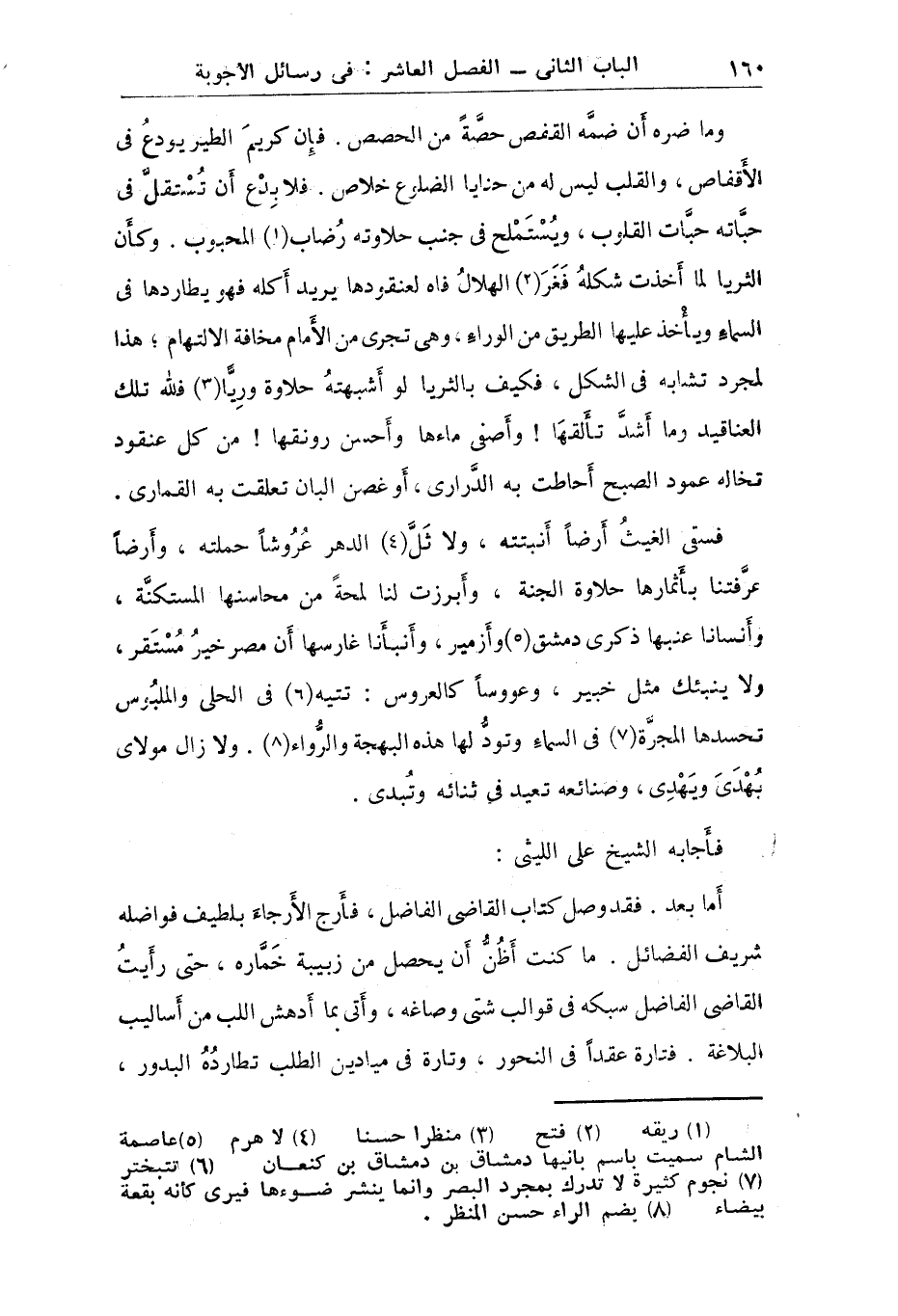 وبعد فقد وصل كتاب القاضي الفاضل وأرج الأرجاء بلطيف فواضله وشريف الفضائل وما كنت أظن أن يحصل من زبيبه خماره حتى رأيت الفاضل سبكه في قوالب شتى وصاغه وأتى بما أدهش اللب من أساليب البلاغة فتارة عقداً على النحور وتارة في ميادين الطلب تطارده البدور