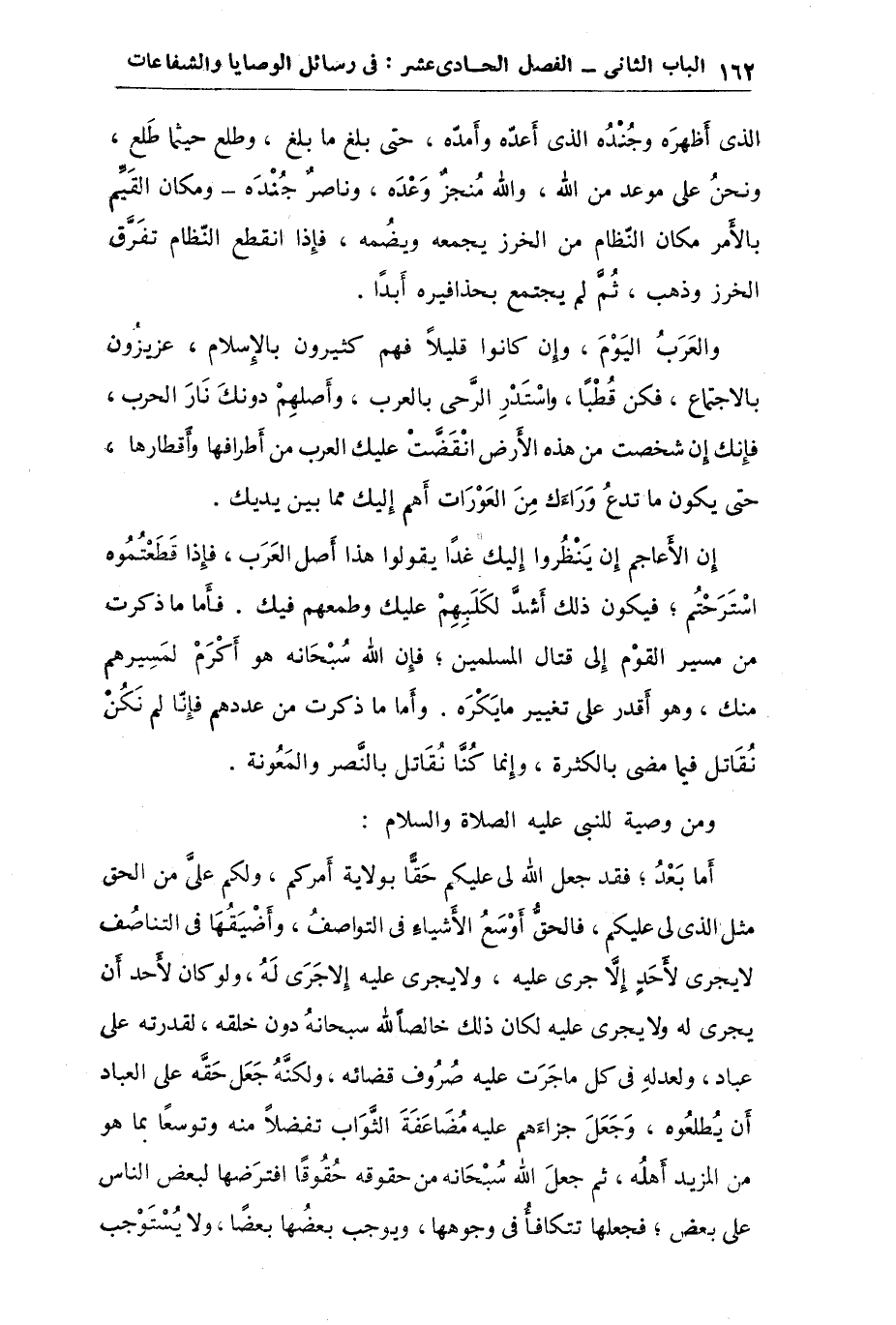 والعرب اليوم وإن كانوا قليلاً فهم كثيرون بالإسلام عزيزون بالاجتماع فكن قطباً واستدر الرحى بالعرب وأصلهم دونك نار الحرب فإنك إن شخصت من هذه الأرض انتقضت عليك العرب من أطرافها وأقطارها حتى يكون ما تدع وراءك من العورات أهم إليك مما بين يديك.