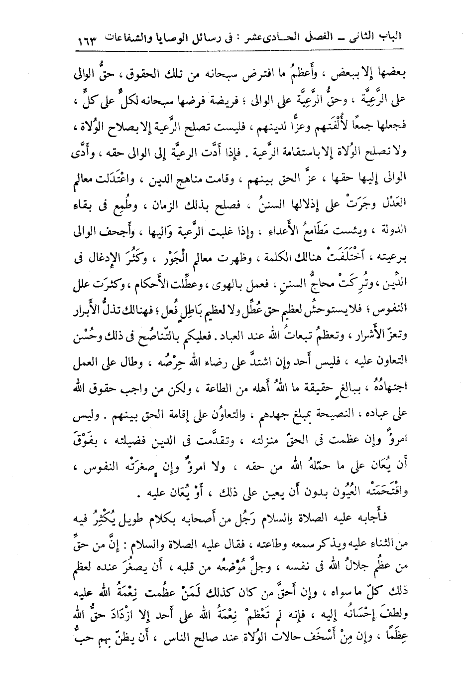 يستوجب بعضها إلا ببعض وأعظم ما افترض سبحانه من تلك الحقوق حق الوالي على الرعية وحق الرعية على الوالي فريضة فرضها سبحانه لكل على كل فجعلها نظاماً لألفتهم وعزاً لدينهم فليست تصلح الرعية إلا بصلاح الولاة ولا تصلح الولاة إلا باستقامة الرعية فإذا أدت الرعية إلى الوالي حقه وأدجى الوالي إليها حقها عز الحق بينهم وقامت مناهج الدين واعتدلت معالم العجل وجرت على أذلالها السنن فصلح بذلك الزمان وطمع في بقاء الدولة ويئست مطامع الأعداء وإذا غلبت الرعية وإليها وأجحف الوالي برعيته اختلفت هنالك الكلمة وظهرت معالم الجور وكثر الإدغال في الدين وتركت محاج السنن فعمل بالهوى وعطلت الأحكام وكثر علل النفوس فلا يستوحش لعظيم حق عطل ولا لعظيم باطل فهل فهنالك تذل الأبرار وتعز الأشرار وتعظم تبعات الله عند العباد فعليكم بالتناصح في ذلك وحسن التعاون عليه فليس أحد وإن اشتد على رضاء الله حرصه وطال في العمل اجتهاده لبالغ حقيقة ما الله أهله من الطاعة: ولكن من واجب حقوق الله على العباد النصيحة بمبلغ جهدهم والتعاون على إقامة الحق بينهم وليس امرؤ وإن عظمت في الحق منزلته وتقدمت في الدين فضيلته يفوق أن يعان على ما حمله الله من حقه ولا امرؤ وإن صغرته النفوس واقتحمته العيون بدون أن يعين على ذلك أو يعان عليه.