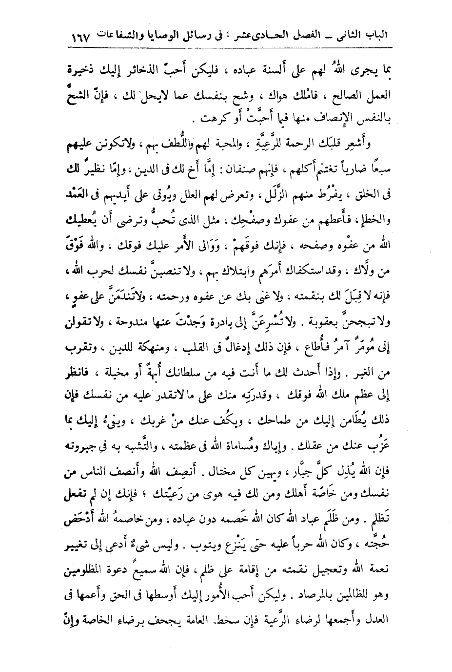 الولاة قبلك، ويقولون فيك كما كنت تقول فيهم وإنما يستدل على الصالحين بما يجري الله لهم على ألسنة عباده فليكن أحب الذخائر إليك ذخيرة العمل الصالح فاملك هواك وشح بنفسك عما لا يحل لك فإن الشح بالنفس الإنصاف منها فيما أحبت أو كرهت: واشعر قلبك الرحمة للرعية والمحبة لهم واللطف بهم ولا تكونن عليهم سبعاً ضارياً تغتنم أكلهم فإنهم صنفان إما أخ لك في الدين وإما نظير لك في الخلق يفرط منهم الزلل وتعرض لهم العلل ويؤتى على أيديهم في العمد والخطأ فأعطهم من عفوك وصفحك مثل الذي تحب وترضى أن يعطيك الله من عفوه وصفحه فإنك فوقهم ووالي الأمر عليك فوقك والله فوق من ولاك وقد استكفاك أمرهم وابتلاك بهم ولا تنصبن نفسك لحرب الله فإنه لا يدى لك بنقمته ولا غنى بك عن عفوه ورحمته ولا تندمن على عفو ولا تبجحن بعقوبة ولا تسرعن إلى بادرة وجدت عنها مندوحة ولا تقولن إني مؤثر آمر فأطاع فإن ذلك إدغال في القلب ومنهكة للدين وتقرب من الغير وإذا أحدث لك ما أنت فيه من سلطانك أبهة أو مخيلة فانظر إلى عظم ملك الله فوقك وقدرته منك على ما لا تقدر عليه من نفسك فإن ذلك يطامن إليك من طماحك ويكف عنك من غربك ويفيء إليك بما عزب عنك من عقلك وإياك ومساماة الله في عظمته والتشبه به في جبروته فإن الله يذل كل جبار ويهين كل محتال أنصف الله وأنصف الناس من نفسك ومن خاصة اهلك ومن لك فيه هوى من رعيتك فإنك إن لم تفعل تظلم ومن ظلم عباد الله كان الله خصمه دون عباده ومن خاصمه الله أدحض حجته وكان الله حرباً حتى ينزع ويتوب وليس شيء أدعى إلى تغيير نعمة الله وتعجيل نقمته من إقامة على ظلم فإن الله سميع دعوة المظلومين وهو للظالمين بالمرصاد. وليكن أحب الأمور إليك أوسطها في الحق وأعمها في العدل وأجمعها لرضاء الرعية