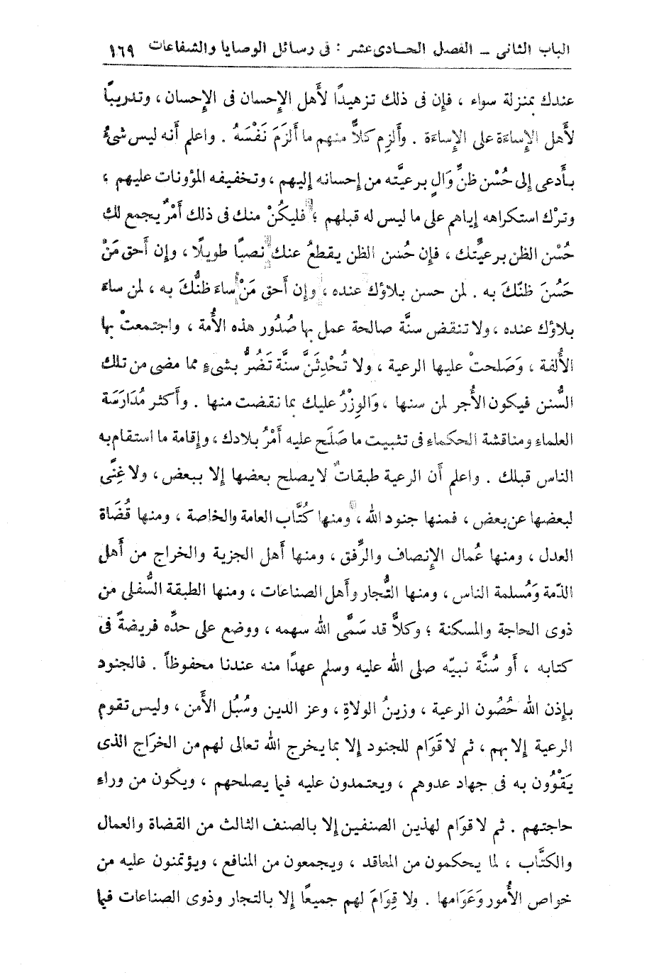 عمل بها صدور هذه الأمة واجتمعت بها الألفة وصلحت عليها الرعية ولا تحدثن سنة تضر بشيء مما مضي من تلك السنن فيكون الأجر لمن سنها والوزر عليك بما نقضت منها: وأكثر مدارسة العلماء ومناقشة الحكماء في تثبيت ما صلح عليه أمر بلادك وإقامة ما استقام به الناس قبلك: واعلم أن الرعية طبقات لا يصلح بعضها إلا ببعض ولا غنى ببعضها عن بعض فمنها جنود الله ومنها كتاب العامة والخاصة ومنها قضاة العدل ومنها عمال الأنصاف والرفق ومنها أهل الجزية والخراج من أهل الذمة ومسلمة الناس ومنها التجار وأهل الصناعات ومنها الطبقة السفلى من ذوي الحاجة والمسكنة وكلا قد سمى الله سهمه ووضع على حده فريضة في كتابه أو سنة نبيه (عهداً منه عندنا محفوظاً فالجنود بإذن الله حصون الرعية وزين الولاة وعز الدين وسبل الأمن وليس تقوم الرعية إلا بهم ثم لا قوام للجنود إلا بما يخرج الله تعالى لهم من الخراج الذي يقوون به في جهاد عدوهم ويعتمدون عليه فيما يصلحهم ويكون من وراء حاجتهم ثم لا قوام لهذين الصنفين إلا بالصنف الثالث من القضاة والعمال والكتاب لما يحكمون من المقاعد ويجمعون من المنافع ويؤتمنون عليه من خواص الأمور وعوامها ولا قوام لهم جميعاً إلا