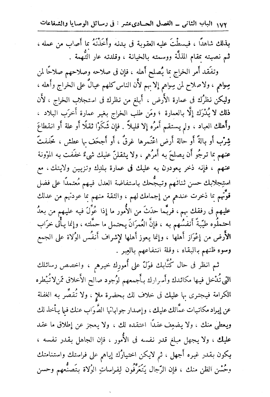 بدنه وأخذته بما أصاب من عمله ثم نصبته بمقام المذلة ووسمته بالخيانة وقلدته عار التهمة وتفقد أمر الخراج بما يصلح أهله فإن في صلاحه وصلاحهم صلاحاً لمن سواهم ولا صلاح لمن سواهم إلا بهم لأن الناس كلهم عيال على الخراج وأهله: وليكن نظرك عمارة الأرض أبلغ من نظرك في استجلاب الخراج لأن ذلك لا يدرك إلا بالعمارة ومن طلب الخراج بغير عمارة أخرب البلاد وأهلك العباد ولم يستقم أمره إلا قليلاً فإن شكوا ثقلاً أو علة أو انقطاع شرب أو بالة أو إحاطة أرض اعتمرها غرق أو أجحف بها عطش خففت عنهم بما ترجو أن يصلح به أمرهم: ولا يثقلن عليك شيء خففت به المؤونة عنهم فإنه ذخر يعودون به عليك في عمارة بلدك وتزيين ولايتك مع استجلابك حسن ثنائهم وتبجحك بى استفاضة العدل فيهم معتمداً فضل قوتهم بما ذخرت عندهم من إجمامك لهم والثقة منهم بما عودتهم من عدلك عليهم في رفقك بهم فربما حدث من الأمور ما إذا عول فيه عليهم من بعد احتملوه طيبة أنفسهم به فإن العمران يحتمل ما حملته وإنما يأتي خراب الأرض من أعواز أهلها وإنما يعوز أهلها لإشراف أو نفس الولاة على الجمع وسوء ظنهم بالبقاء وقلة انتفاعهم بالعبر ثم انظر في حال كتابك فول على أمورك خيرهم وأخصص رسائلك التي تدخل فيها مكائدك وأسرارك بأجمعهم لوجوه صالح الأخلاق ممن لا تبطره الكرامة فيجترئ بها عليك في خلاف لك بحضرة ملأ ولا تقصر به الغفلة عن إيراد مكاتبات عمالك عليك وإصدار جواباتها على الصواب عنك فيما يأخذ لك ويعطى منك ولا يضعف عقداً اعتقده لك ولا يعجز عن إطلاق ما عقد عليك ولا يجهل مبلغ قدر نفسه في الأمور فإن الجاهل بقدر نفسه يكون بقدر غيره أجهل: ثم لا يكن اختيارك إياهم على فراستك واستنامتك وحسن الظن منك فإن الرجال يتعرفون لفراسات الولاة