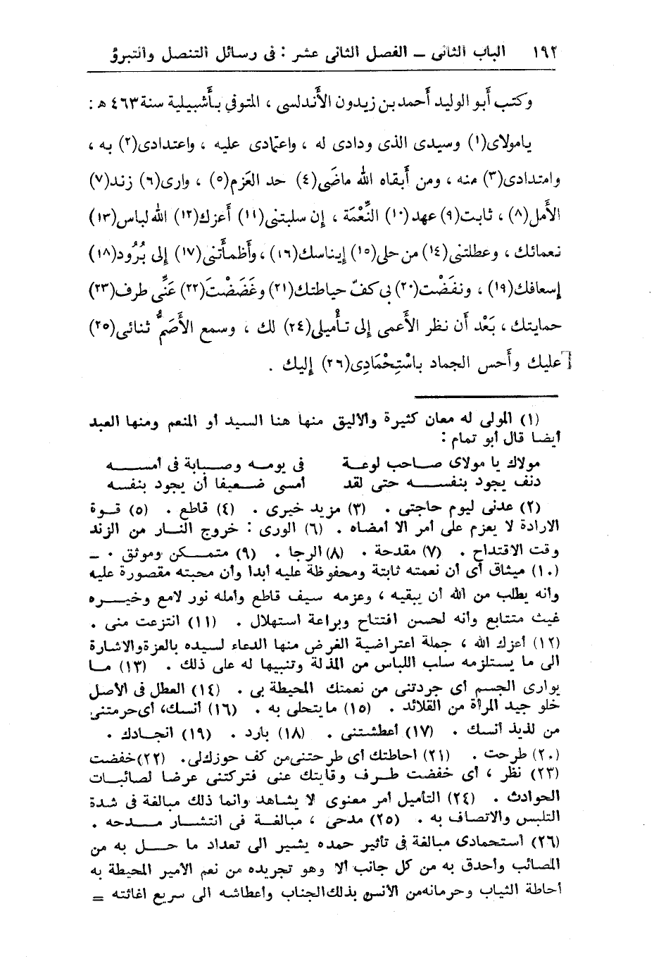 يا مولاي وسيدي الذي ودادي له واعتمادي عليه واعتدادي به وامتدادي منه ومن أبقاه الله ماضي حد العزم وأرى زند الأمل ثابت عهد النعمة إن سلبتني أعزك الله لباس نعمائك وعطلتني من حلى إيناسك وأظمأتني إلى برود إسعافك ونفضت بي كف حياطتك وغضضت عني طرف حمايتك بعد أن نظر الأعمى إلى تأميلي لك وسمع الأصم ثنائي عليك وأحس الجماد باستحمادي إليك.