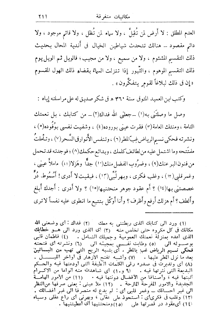 "وكتب ابن العميد المتوفى سنة 360هـ? في شكر صديق له على مراسلته إياه"