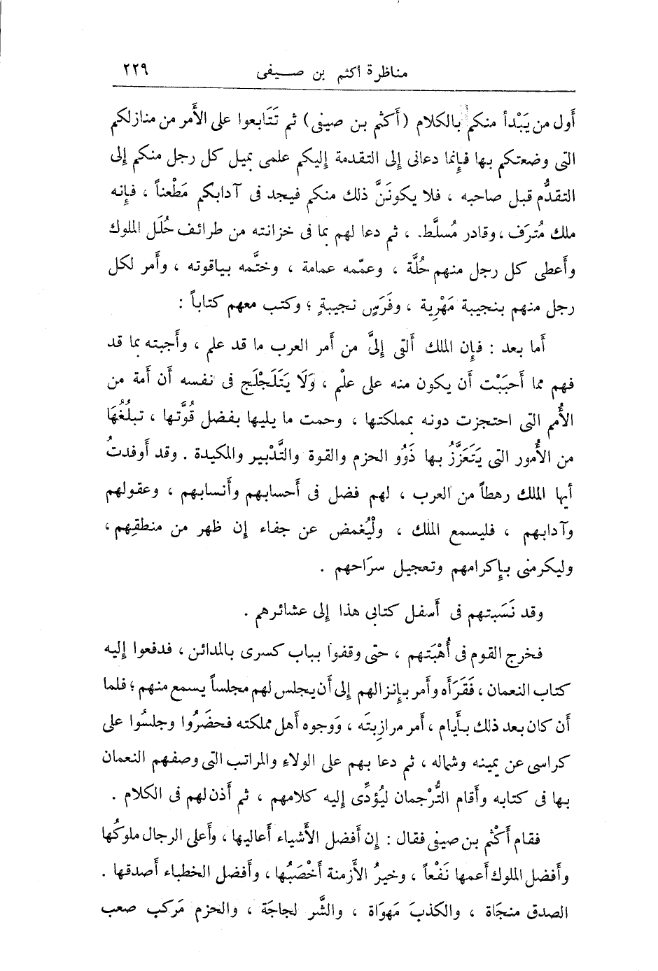 فقام أكثم بن صفي فقال إن أفضل الأشياء أعاليها وأعلى الرجال ملوكها وأفضل الملوك أعمها نفعاً وخيرُ الأزمنة أخصبها وأفضل الخطباء أصدقها.