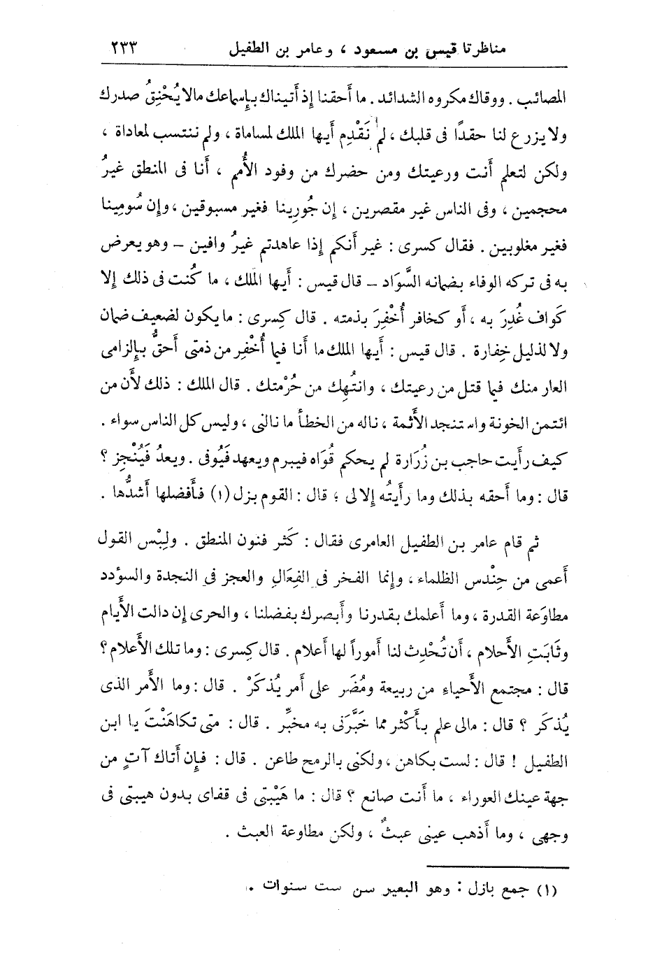 المصاب ووقاك مكروه الشصائب ما أحقنا إذا أتيناك ما لا يحنق صرك ولا يزرع لنا حقداً في قلبك لم تقدم أيها الملك لمساماة ولم ننتسب لمعاداة ولكن لتعلن أنت ورعيتك ومن حضرك من وفود الأمم أما في المنطق غير محجمين وفي الناس غير مقرصين وإن جورينا فغير مسبوقين وإن سومينا فغير مغلوبين قال كسرى غير أنكم إذا عاهدتم غير وافين وهو يعرض به في تركه الوفاء بضمانه السواد: قال قيس أيها الملك ما كنت في ذلك إلا كوافٍ غدر به أو كخافر خفر بذمته قال كسرى ما يكون لضعيف ضمان ولا لذليل خفارة قال قيس أيها الملك م أنا فيما أخفر من ذمتي أحق بإلزامي العار منك فيما قتل من رعيتك وانتهك من حرمتك قال كسرى ذلك لأن من ائتمن الخانة واستنجد الأئمة ناله من الخطأ ما نالني وليس كل الناس سواء، كيف رأيت حاجب بن زرارة لم يحكم قواه فيبرم ويعهد فيوفي ويعد فينجز، قال وما أحقه بلك وما رأيته إلا لي قال كسرى القوم بزل فأفضلها أشدها.
