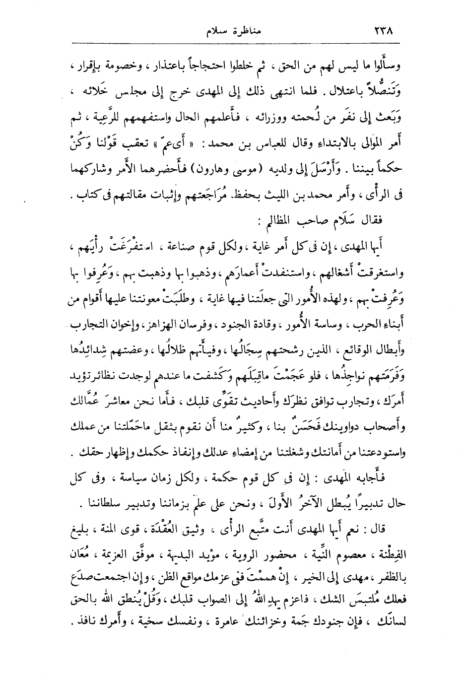 فقال سلام صاحب المظالم: أيها المهدي إن في كل أمر غاية ولكل قوم صناعة استفرغت رأيهم واستغرقت أشغالهم واستنفدت أعمارهم وذهبوا بها وذهبت بهم وعرفوا بهم ولهذه الأمور التي جعلتنا فيها غاية وطلبت معونتنا عليها أقوام من أبناء الحرب وساسة الأمور وقادة الجنود وفرسان الهزاهز وإخوان التجارب وأبطال الوقائع الذين رشحهم سجالها وفياتهم ظلالها وعضتهم شدائدها وفرمتهم نواجذها فلو عجمت ما قبلهم وكشفت ما عندهم لوحدت نظائر تؤيد أمرك وتجارب توافق نظرك وأحاديث تقوي قلبك فأما نحن معاشر عمالك وأصحاب دواوينك فحسنٌ بنا، وكثيرٌ منا أن نقوم بثقل ما حملتنا من عملك واستودعتنا من أمانتك وشغلتنا من إمضاء عدك وإنفاذ حكمك إظهار حقك.