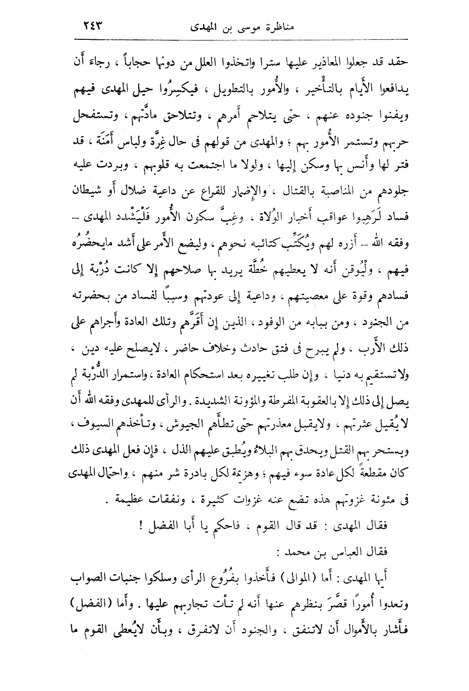 فقال العباس بن محمد: أيها المهدي أما (الموالي9 فأخذوا بفروع الرأي وسلكوا جنبات الصواب وتعدوا أموراً قصر بنظرهم عنها وأه لم يأت تجاربهم عليها وأما (الفضل) فأشار بالأموال أن لا تنفق والجنود أن لا تفرق وبأن لا يعطي القوم ما طلبوا