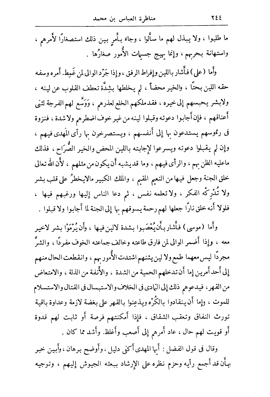 وقاتل في قول الفضل: أيها المهدي أكفى دليل أوضح برهان وأبين خبر بأن فد أجمع رأيه وحزم نظره على الإرشاد ببعثة الجيوش إليهم وتوجيه