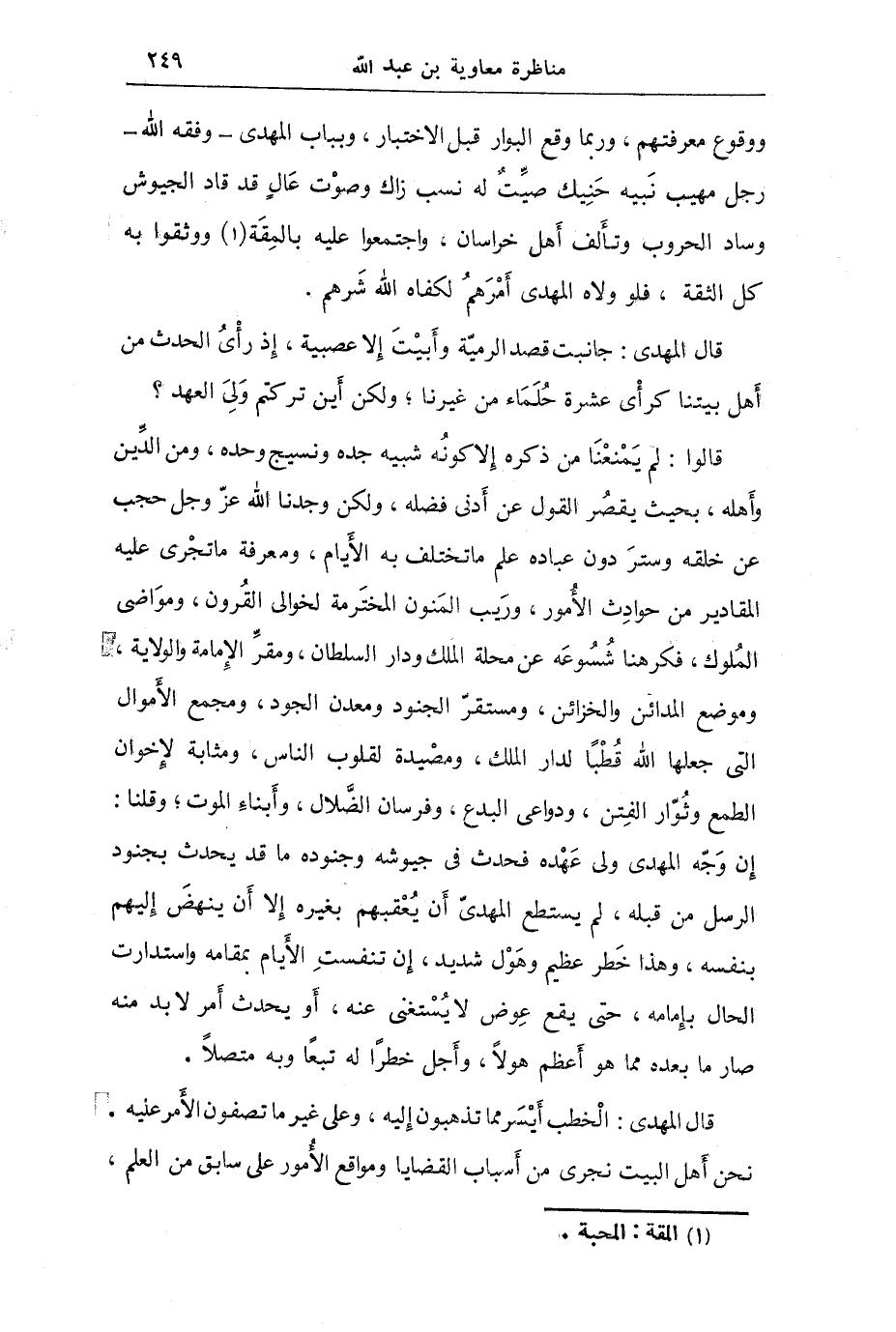 قالوا: لم يمنعنا من ذكره إلا كونه شبيه جده ونسيج وده ومن الدين وأهله بحي يقصر القول عن أدنى فضله وكن وجدنا الله عز وجل حجب عن خلقه وستر دون عباده علم ما تختلف به الأيام ومعرفة ما تجري عليه المقادير من حوادث الأمور وريب المنون المخترمة لخوالي القرون ومواضي الملوك فكرهنا شسوعه ن محله الملك ودار السلطان ومقر الإمامة والولاية وموضع المدائن والخزائن ومستقر الجنود ومعدن الجود ومجمع الأموال التي جعلها الله قطباً لدار الملك ومصيدة لقلوب الناس ومثابة لإخوان الطمع وثوار الفتن وداعي البدع وفرسان الضلال وأبناء الموت لقلوب الناس ومثابة لإخوان الطمع وثوار الفتن ودواعي البدع وفرسان الضلال وأبناء الموت وقلنا إن وجه المهدي ولي عهده فحدث في جيوشه وجنوده ما قد حدث بجنود الرسل من قبله لم يستطع المهدي أن يعقبهم بغيره إلا أن ينهد إليهم بنسفه وهذا خطر عظيم وهول شديد إن تنفست الأيام بمقامة واستدارت الحال بإمامه حتى يقع عوض لا يستغنى عنه أو يحدث أمر لابد منه صار ما بعد ما هو أعظم وأجل خطراً له تبعاً وبه متصلاً.