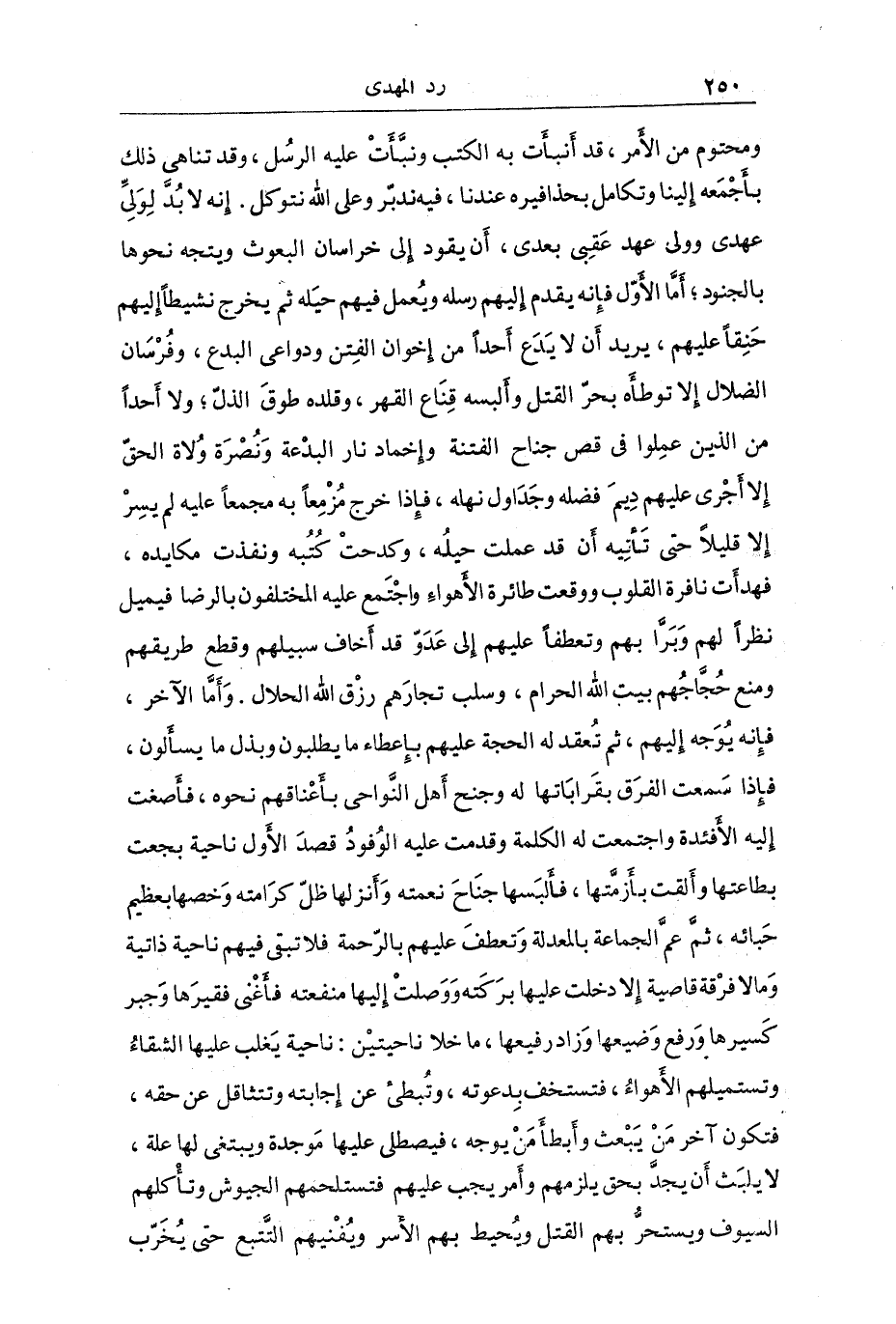 العلم ومحتوم من الأمر قد أنبأت به الكتب ونبأت عليه الرسل وولي عهد عقبي بعدي أن يقود إلى خراسان البعوث ويتوجه نحوها بالجنود أما الأول فإنه يقدم إليهم رسله ويعمل فيهم حيله ثم يخرج نشطاً حنقاً عليهم يريد أن لا يدع أحداً من إخوان الفتن ودواعي البدع وفرسان الضلال إلا توطأة بحر القتل والبسه قناع القهر وقلده طوق الذل ولا أحد من الذين عملوا في قص جناح الفتنة وإخماد نار لبدعة ونصرة ولاة الحق إلا أجرى عليهم ديم فضله وداول نهله فإذا خرج مزمعاً بع مجمعاً عليه لم يسر إلا قليلاً حتى تأتيه أن قد عملت محيلة وكدحت كتبه ونفذت مكايده فهدأت نافرة القلوب وقعت طائرة الأهواء واجتمع عليه المختلفون بالرضى فيميل نظراُ لهم وبراً بهم وتعطفاً عليهم إلى عدو قد أخاف سبيلهم وقطع طريقهم ومنع حجاجهم بين اله الحرام وسلب تجارهم رزق الله الحلال وأما الآخر فإنه يوجع إليهم ثم تعتقد له الحجة عليهم بإعطاء ما يطلبون وبذل ما يسألون فإذا سمحت الفرق بقراباتها له وجنح أهل النواحي بأعناقهم نحوه فأضعت إليه الأفئدة واجتمعت له الكلمة وقدمت عليه الوفود قصد الأول ناحية نجعت بطاعتها وأفت بأزمتها عليهم بالرمة فاتقى فيهم ناحية وأنزلها ظل كرامته ولا فرقة قاصية إلا دخلت عليها بركته ووصلت إليها منفعته فأغنى فقيرها وجبر كسيرها ورفع وضيعها وزاد رفيعها ما خلا ناحيتي ناحية يغلب عليها الشقاء وتستمليهم الأهواء فتستخف بدعوته وتبطئ عن إجابته وتتثاقل عن حقه فتكون آخر من يبعث وأبطا من يوجه فيصطلي عليها موجودة ويبتغي لها علة لا يبث أن يجد بحق يلزمهم وأمر يجب عليهم فتستلحمهم الجيوش وتأكلهم السيوف ويستحر بهم القتل ويحيط بهم الأسر ويفنيهم التتبع حتى يخرب البلاد ويوتم الأولاد وناحية لا يبسط لهم أماناً ولا يقبل لهم عهداً