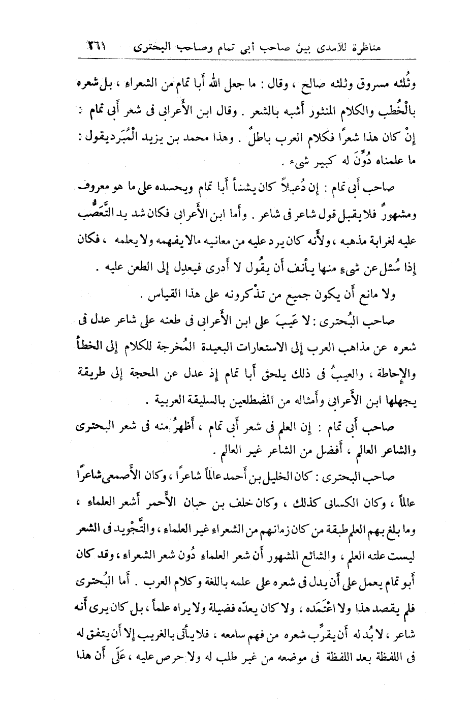 (صاحب أبي تمام) إن العلم في شعر أبي تمام أظهر منه في شعر البحتري والشاعر العالم أفضل من الشاعر غير العالم.