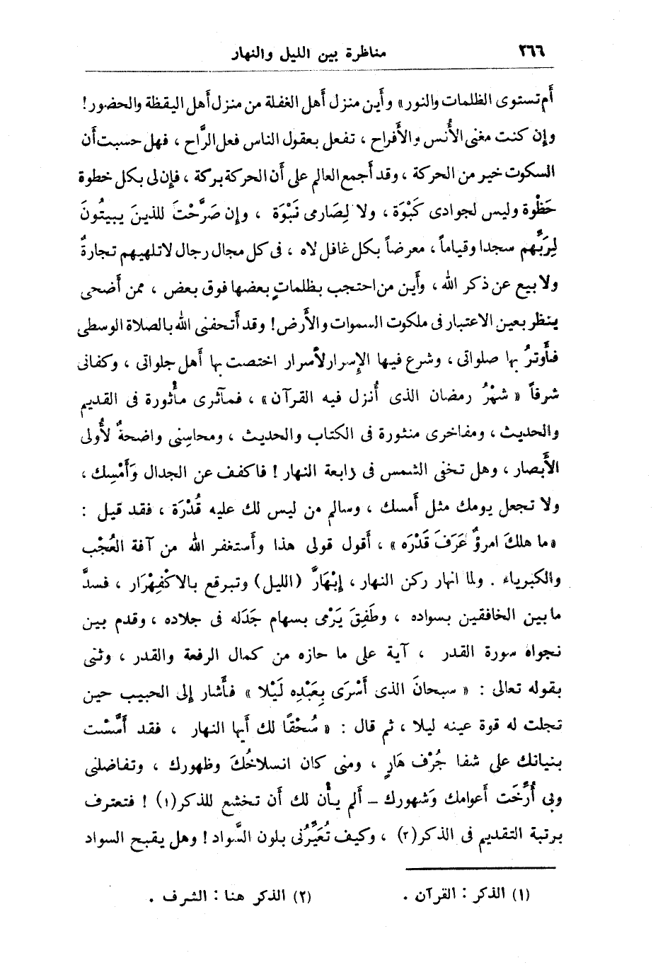 الظّلُمَاتُ وَالنّورُ) [الرعد: 16] وأين منزل أهل الغفلة من منزل أهل اليقظة والحضور وإن كنت مغنى الأنس والأفراح تفعل بعقول الناس فعل الراح فهل حسبت أن السكون خير من الحركة وقد أجمع العالم على أن "الحركة بركة" فإن لي بكل خطوة حظوة وليس لجوادي كبوة ولا لصارمي نبوة وإن صرحت بالذين يبيتون لربهم سجداً وقياماً معرضاً بكل غافل لاه في كل مجال (رِجَالٌ لاّ تُلْهِيهِمْ تِجَارَةٌ وَلاَ بَيْعٌ عَن ذِكْرِ اللهِ) [النور: 37] وأين من احتجب بظلمات بعضها فوق بعض ممن أضحى ينظر بعين الاعتبار في ملكوت السموات والأرض وقد أتحفني الله بالصلاة الوسطى فأوتر بها صلواتي وشرع فيها الإسرار لأسرار اختصت بها أهل جلوتي وكفاني شرفاً (شَهْرُ رَمَضَانَ الّذِيَ أُنْزِلَ فِيهِ الْقُرْآنُ) [البقرة: 185] فمآثري مأثورة في القديم والحديث ومفاخري منثورة في الكتاب والحديث ومحاسني واضحة لأولي الأبصار وهل تخفى الشمس في رائعة النهار فاكفف عن الجدال وأمسك ولا تجعل يومك مثل أمسك وسالم من ليس لك عليه قدرة فقد قيل: (ما هلك امرؤ عرف قدره) أقول قولي هذا واستغفر الله من آفة العجب والكبرياء ولما انهار ركن النهار ابهارّ (الليل) وتبرقع بالاكفهرار فسد ما بين الخافقين بسواده وطفق يرمي بسهام جداله في جلاده وقدم بين نجواه سورة القدر آية على ما حازه من كمال الرفعة والقدر وثني بقوله تعالى: (سُبْحَانَ الّذِي أَسْرَىَ بِعَبْدِهِ لَيْلاً) [الإسراء: 1] فأشار إلى الحبيب حين تجلت له قرة عينه ليلاً ثم قال سحقاً لك أيها النهار فقد أسست بنيانك على شفا جرف هارٍ تناضلني ومني كان انسلاخك وظهورك وتفاضلني وبي أرحت أعوامك وشهورك ألم يأن لك أن تخشع للذكر فتعترف لي برتبة التقديم في الذكر وكيف تعيرني بلون السواد وهل يقبح السواد إلا في الفؤاد أم كيف تعيبني