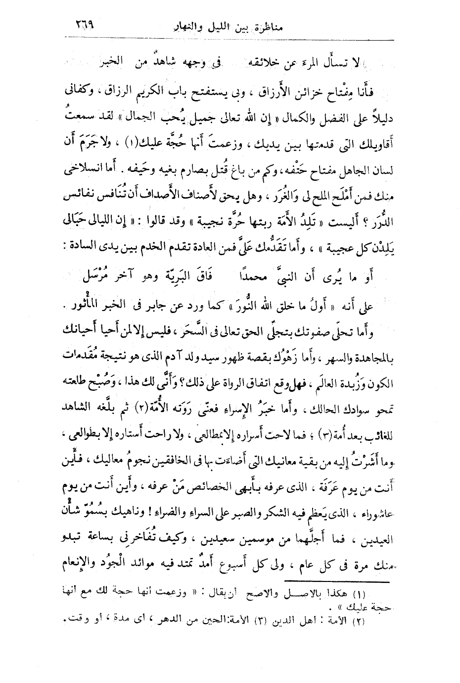 وأما تحلي صفوتك بتجلي الحق تعالى في السحر فليس إلا لمن أحيا أحيانك بالمجاهدة والسهر وأما زهوك بقصة ظهور سيد ولد آدم الذي هو نتيجة مقدمات الكون وزبدة العالم فهل وقع اتفاق الرواة على ذلك وأنى لك هذا وصبح طلعته يمحو سوادك الحالك وأما خبر الإسراء فعني روته الأمة ثم بلغه الشاهد للغائب بعد أمة فما لاحت أسراره إلا بمطالعي ولا زاحت أستاره إلا بطوالعي وما أشرت إليه من بقية معانيك التي أضاءت بها في الخافقين نجوم معاليك فأنت أين من يوم عرفه الذي عرفه بأبهى الخصائص من عرفه وأين أنت من يوم عاشوراء الذي يعظم فيه الشكر والصبر على السراء والضراء وناهيك بسمو شأن العيدين فما أجلها من موسمين سعيدين وكيف تفاخرني بساعة تبدو منك مرة في كل عام ولي في كل