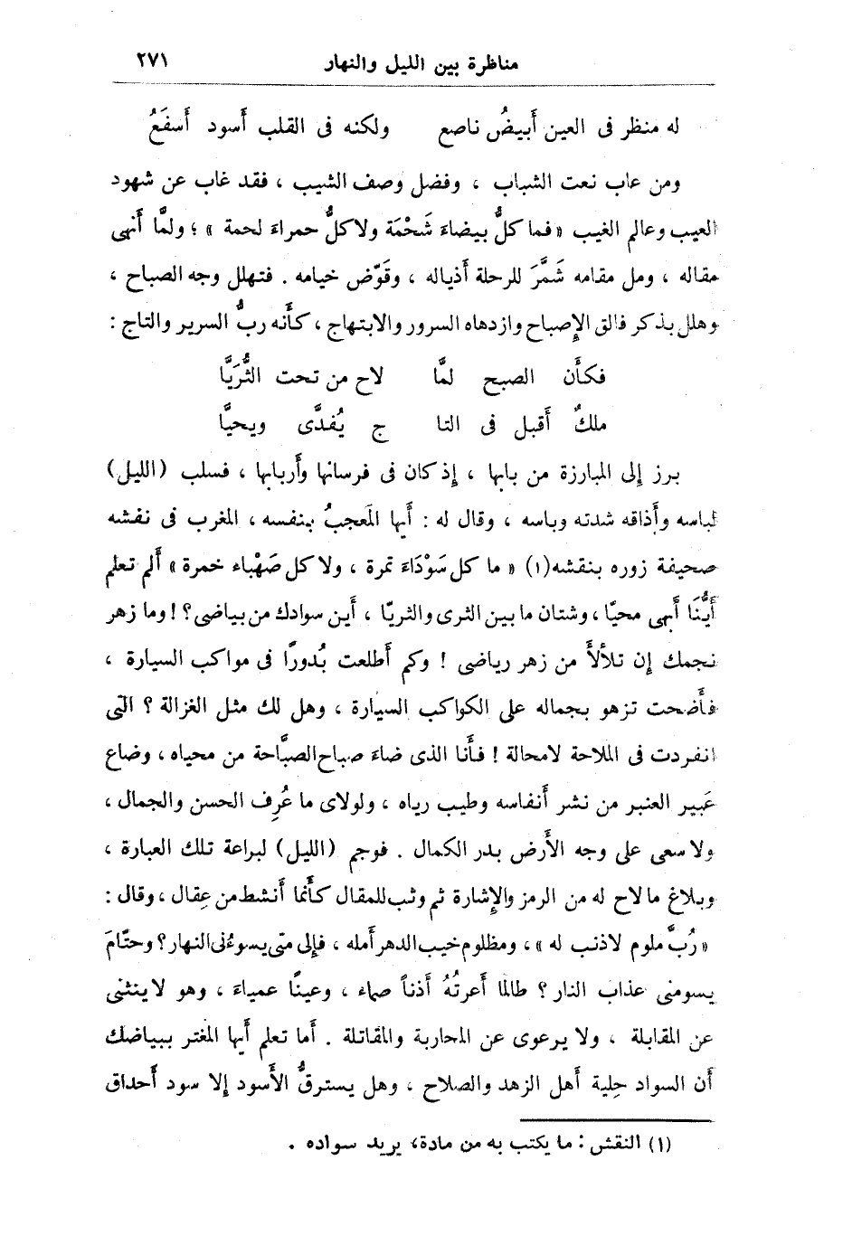 وبرز إلى المبارزة من بابها إذ كان من فرسانها وأربابها فسلب الليل لباسه وأذاقه شدته وبأسه وقال له أيها المعجب بنفسه المغرب في نقشه صحيفة زوره بنقسه (ما كل سوداء تمرة ولا كل صهباء خمرة) ألم تعلم أينا أبهى محيا وشتان ما بين الثرى والثريا أين سوادك من بياضي وما زهر نجمك إن تلألأ زهر رياضي وكم أطلعت بدوراً في مواكب السيارة فأضحت تزهو بجمالها على الكواكب السيارة وهل لك مثل الغزالة التي انفردت في الملاحة لا محالة فأنا الذي ضاء صباح الصباحة من محياه وضاع عبير العنبر من نشر أنفاسه وطيب رياه ولولاي ما عرف الحسن والجمال على وجه الأرض بدر الكمال: فوجم (الليل) لبراعة تلك العبارة وبلاغة ما لاح له من الرمز والإشارة ثم وثب للمقال كأنما أنشط من عقال وقال (رب ملوم لا ذنب له) ومظلوم خبيث الدهر أمله فإلى متى يسوءني النهار وحتى ما يسومني عذاب النار طالما أعرته أذناً صماء وعيناً عمياء وهو لا ينثني عن المقابلة ولا يرعوي عن المحاربة والمقاتلة أما تعلم أيها المغتر ببياضك أن السواد حلية أهل الزهد والصلاح وهل يسترق الأسود إلا سود أحداق الملاح بيد أن الحر لا يبالي بالجمال الظاهر وإنما يباهي بالفعل