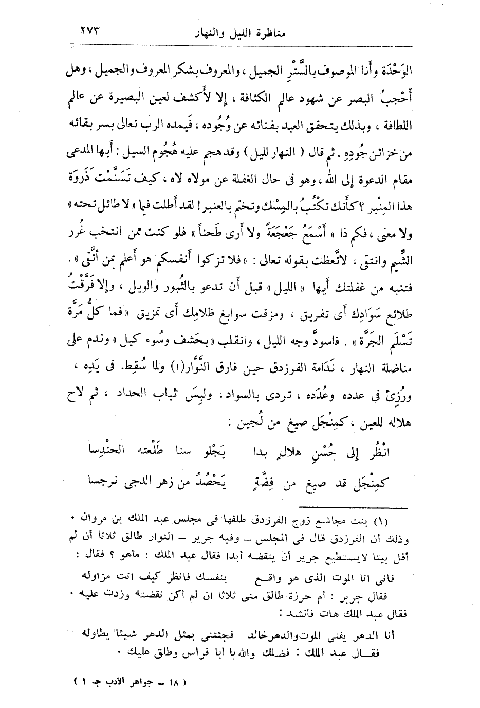 الوحدة وأنا الموصوف بالستر الجميل والمعروف بشكر المعروف والجميل وهل أحجب البصر عن شهود عالم الكثافة إلا لأكشف لعين البصيرة عن عالم اللطافة وبذلك يتحقق العبد بفنائه عن وجوده فيمده الرب تعالى بسر بقائه من خزائن جوده ثم قال: (النهار لليل) وقد هجم عليه هجوم السيل أيها المدعي مقام الدعوة إلى الله وهو في خال الغفلة عن مولاه لاه كيف تسنمت ذروة هذا المنبر كأنك تكتب بالمسك وتختم بالعنبر لقد أطلت فيما (لا طائل تحته) ولا معنى فكم ذا (أسمع جعجعة ولا أرى طحناً) فلو كنت ممن انتخب غرر الشيم وانتقى لاتعظت بقوله تعالى: (فَلاَ تُزَكّوَاْ أَنفُسَكُمْ هُوَ أَعْلَمُ بِمَنِ اتّقَىَ) [النجم: 32] فتنبه من غفلتك أيها "الليل" قبل أن تدعو بالثبور والويل وإلا فرقت طلائع سوادك أي تفريق ومزقت سوابغ ظلمك أي تمزيق (فما كل مرة تسلم الجرة) فاسود وجه الليل وانقلب (بحشف وسوء كيل) وندم على مناضلة النهار ندامة الفرزدق حين فارق النوار (ولما سقط في يده) ورزئ في عدة وعدده ترى بالسواد ولبس ثياب الحداد ثم لاح هلاله للعين كمنجل صنع من لجين.