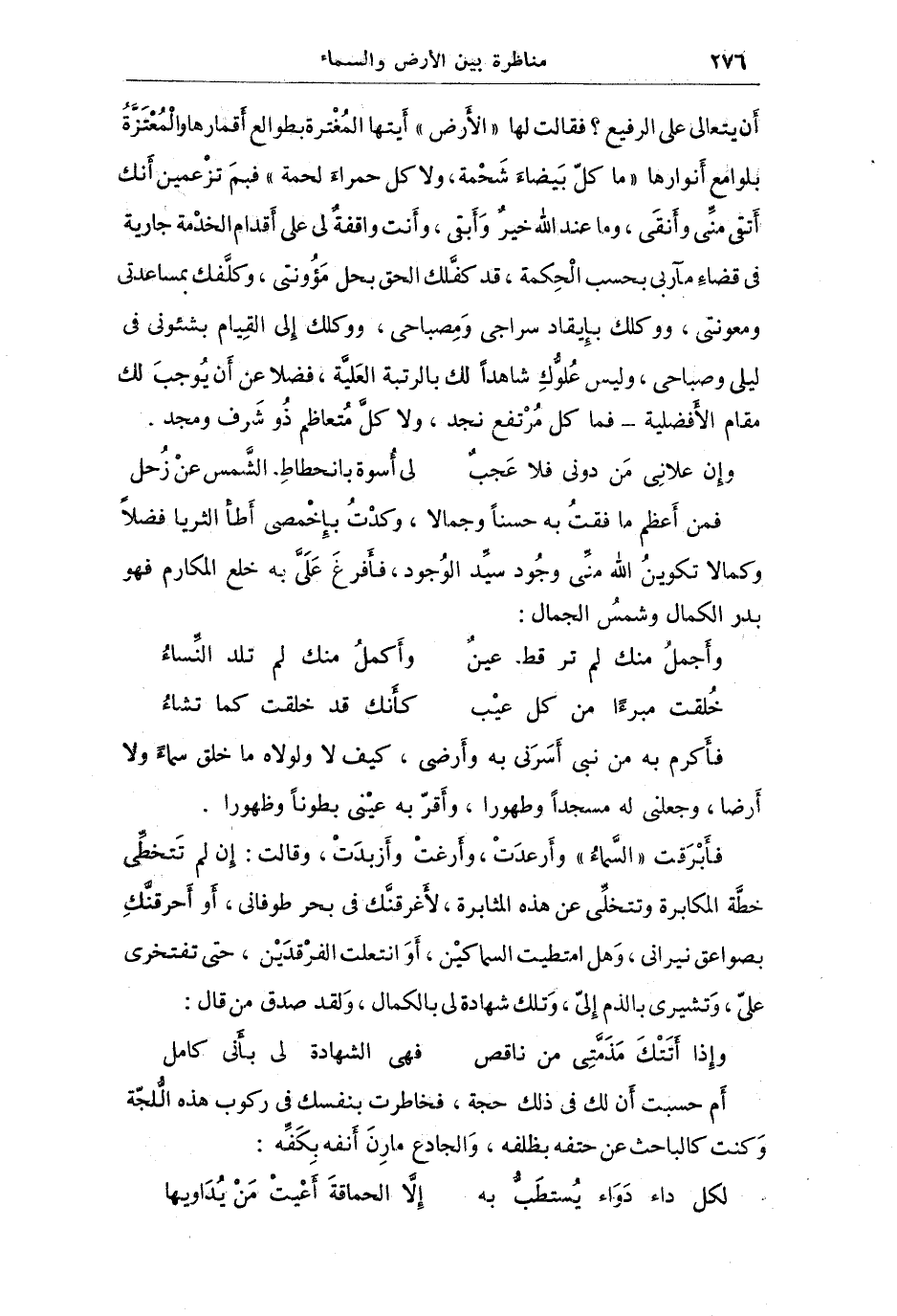فأكرم به من نبي أسرني به وأرضى كيف لا ولولاه ما خلق سماء ولا أرضاً وجعلني له مسجداً وطهوراً وأقر به عيني بطوناً وظهوراً فأبرقت (السماء) وأرعدت وأرغت وأزبدت وقالت إن لم تتخط خطة المكابرة وتتخلى عن هذه المثابرة لأغرقنك في بحار طوفاني أو أحرقنك بصواعق نيراني وهل امتطيت السماكين أو انتعلت الفرقدين حتى تفتخري علي وتشيري بالذم إلي وتلك شهادة لي بالكمال وقد صدق من قال: