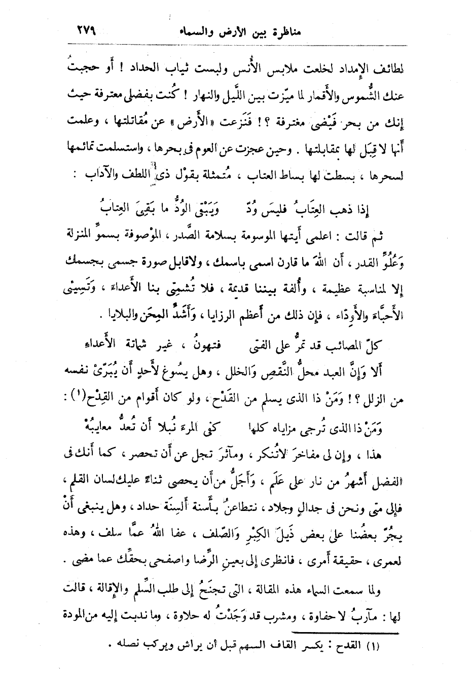 هذا وإن لي مفاخر لا تنكر ومآثر تجل عن أن تحصر كما أنك في الفضل أشهر من نار على علم وأجل من أن يحصى ثناء عليك لسان القلم فإلى متى ونحن في جدال وجلاد نتطاعن بأسئلة ألسنة حداد وهل ينبغي أن يجر بعضنا على بعض ذيل الكبر والصلف ولكن عفا الله عما سلف وهذه لعمري حقيقة أمري فانظري إلي بعين الرضا واصفحي بحقك عما مضى ولما سمعت (السماء) هذه المقالة التي تجنح إلى طلب السلم والإقالة قالت لها مآرب لا حفاوة ومشرب قد وجدت له حلاوة وما ندبت إليه من المودة