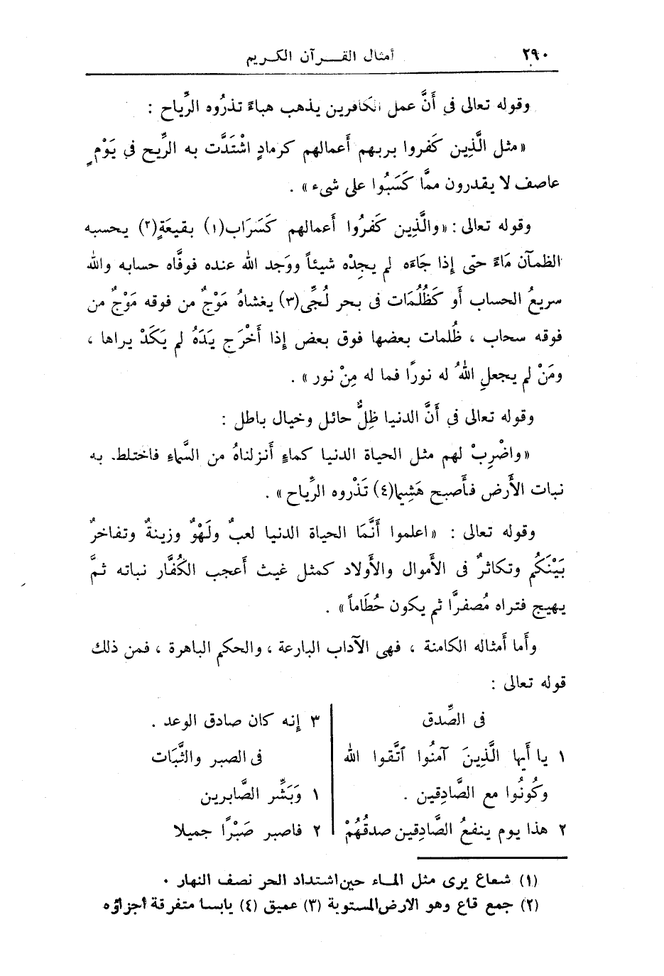 (مّثَلُ الّذِينَ كَفَرُواْ بِرَبّهِمْ أَعْمَالُهُمْ كَرَمَادٍ اشْتَدّتْ بِهِ الرّيحُ فِي يَوْمٍ عَاصِفٍ لاّ يَقْدِرُونَ مِمّا كَسَبُواْ عَلَىَ شَيْءٍ) [إبراهيم: 18] وقوله تعالى: (وَالّذِينَ كَفَرُوَاْ أَعْمَالُهُمْ كَسَرَابٍ بِقِيعَةٍ يَحْسَبُهُ الظّمْآنُ مَآءً حَتّىَ إِذَا جَآءَهُ لَمْ يَجِدْهُ شَيْئاً وَوَجَدَ اللهَ عِندَهُ فَوَفّاهُ حِسَابَهُ وَاللهُ سَرِيعُ الْحِسَابِ {39} أَوْ كَظُلُمَاتٍ فِي بَحْرٍ لّجّيّ يَغْشَاهُ مَوْجٌ مّن فَوْقِهِ مَوْجٌ مّن فَوْقِهِ سَحَابٌ ظُلُمَاتٌ بَعْضُهَا فَوْقَ بَعْضٍ إِذَآ أَخْرَجَ يَدَهُ لَمْ يَكَدْ يَرَاهَا وَمَن لّمْ يَجْعَلِ اللهُ لَهُ نُوراً فَمَا لَهُ مِن نُورٍ) [النور: 39 40] .