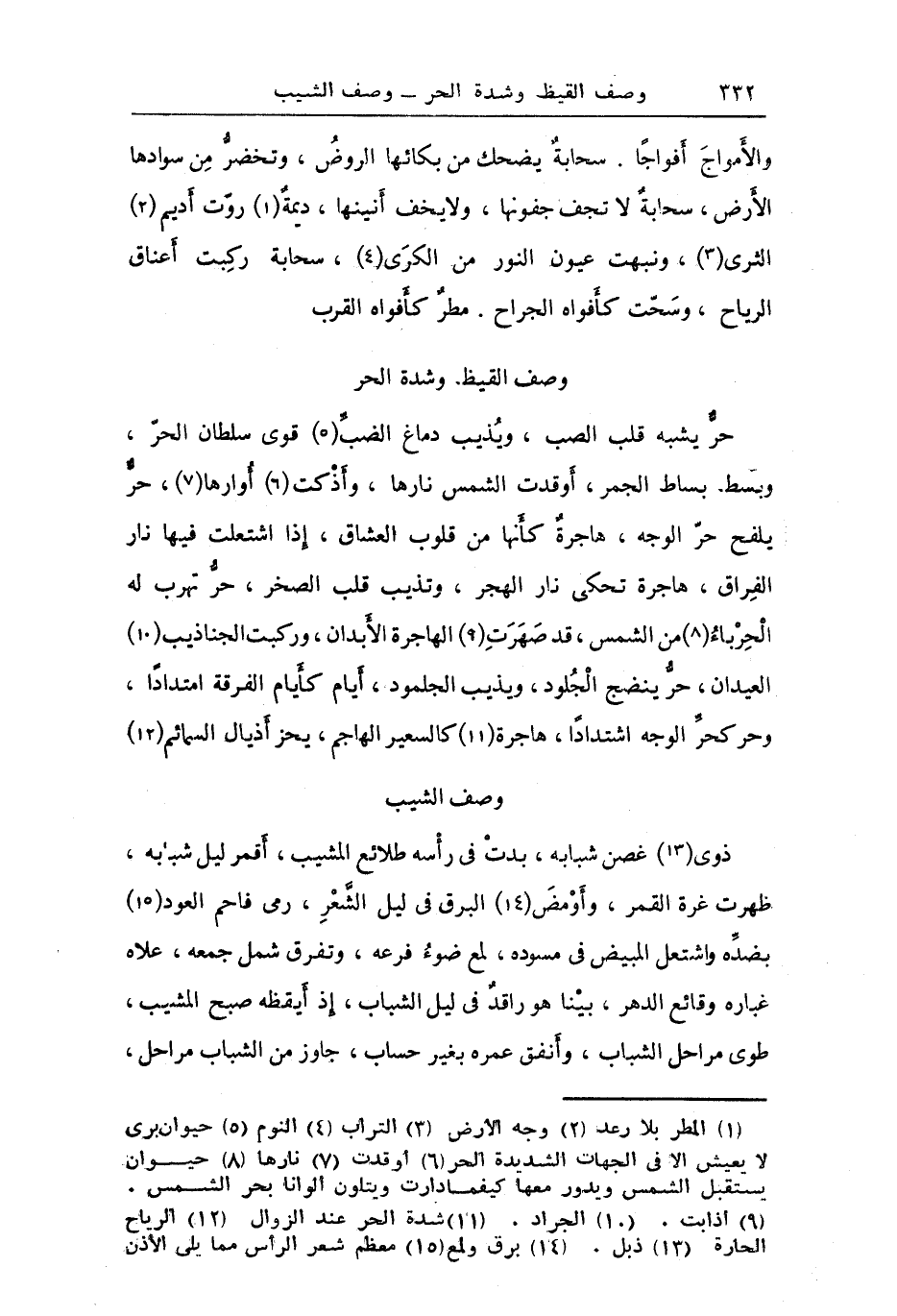 حر يشبه قلب الصب ويذيب دماغ الضب قوي سلطان الحر وبسط بساط الجمر أوقدت الشمس نارها وأذكت أوارها حر يلفح حر الوجه، هاجرة كأنها من قلوب العشاق إذا اشتعلت فيها نار الفراق هاجرة تحكي نار المهجر وتذيب قلب الصخر حلا يهرب له الحرباء من الشمس قد صهرت الهاجرة الأبدان وركبت الجنادب العيدان حر ينضج الجلود ويذيب الجلمود أيام كأيام الفرقة امتداداً وحر كحر الوجد اشتداداً هاجرة كالسعير الهاجم يجر أذيال السمائم.