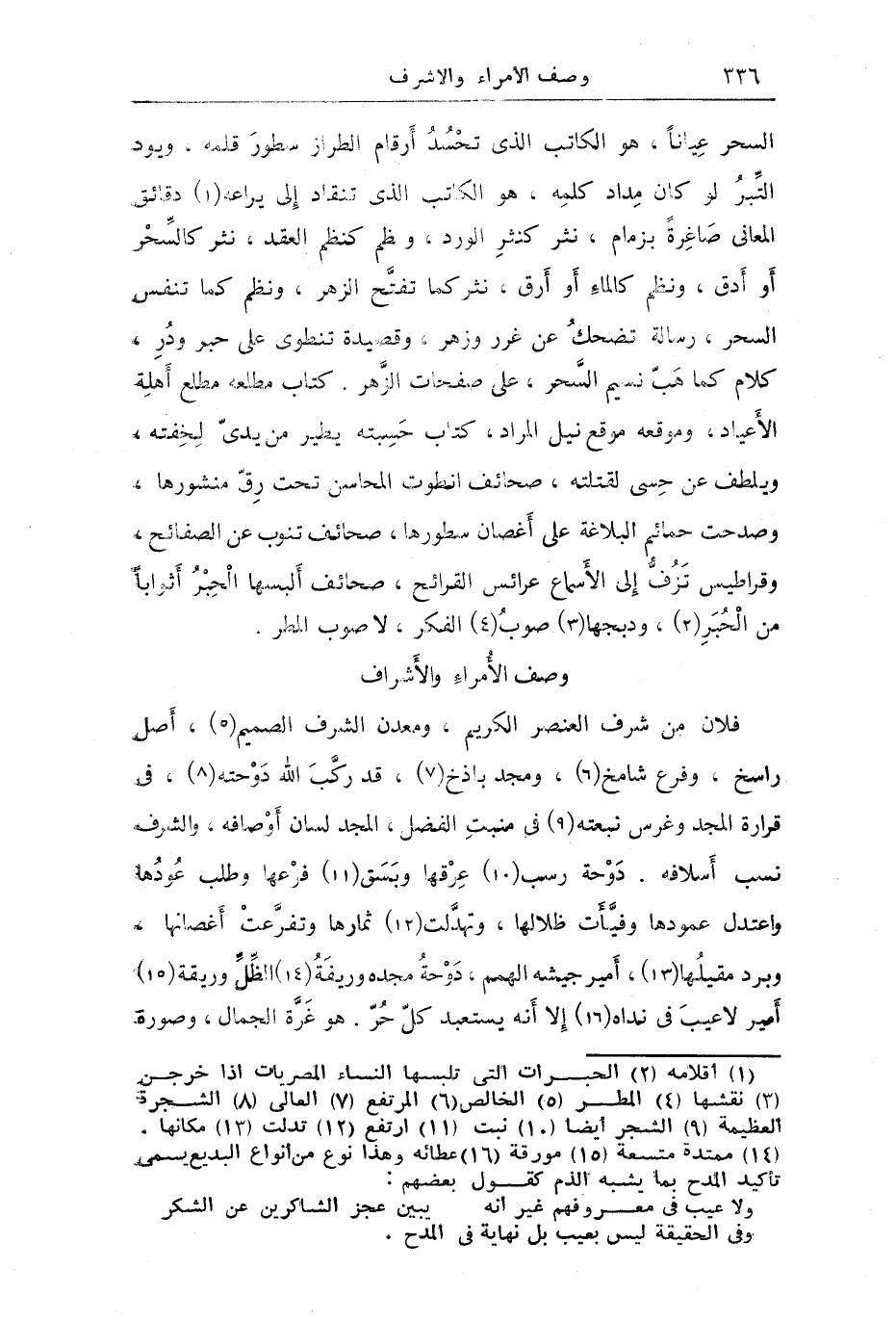الذي تحسد أرقام الطراز سطور قلمه ويود التبر لو كان مداد كلمة هو الكاتب لذي تنقاد إلى يراعه دقائق المعاني صاغرة بزمام، نثر كمثر الورد ونظم كنظم العقد نثر كالسحر أو أدق ونظم كالماء أو أرق نثر كما تفتح الزهر ونظم كما تنفس السحر، رسالة تضحك عن غرر وزهر وقصيدة تنطوي على حبر ودرر كلام كما هب نسيم السحر على صفحات الزهر، كتاب مطلعه مطلع أهله الأعياد وموقعه موقع نيل المراد، كتاب حسبته يطير من يدي لخفته ويلطف عن حسي لقلته صحائف تنوب عن الصفائح وقراطيس تزف إلى الأسماع عرائس القرائح صحائف ألبسها الحبر أثواباً من الحبر ودبجها صوب الفكر لا صوب المطر.