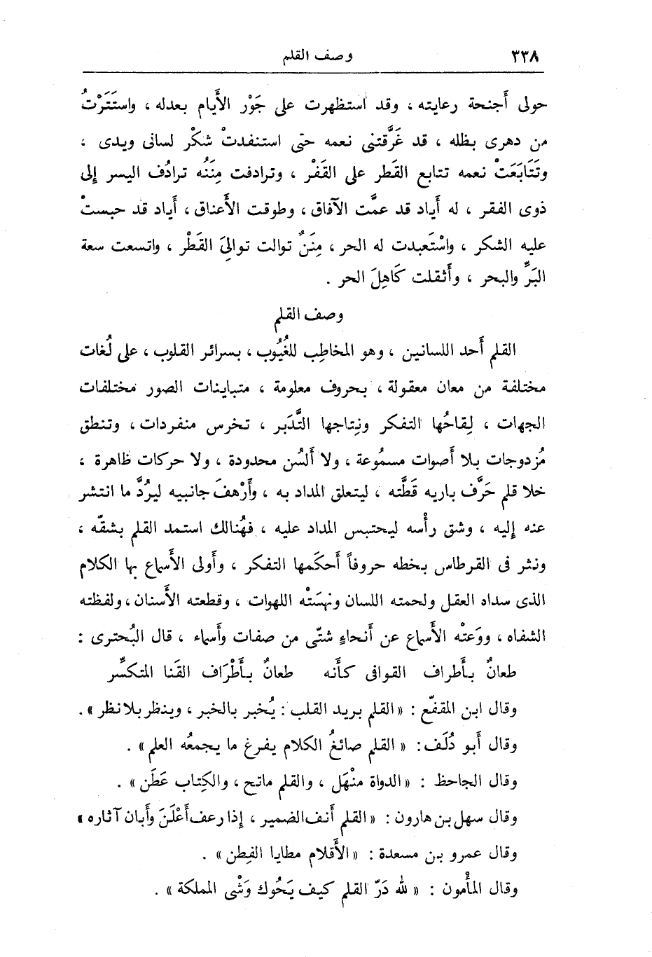 القلم أحد اللسانين وهو المخاطب للغيوب بسرائر القلوب على لغات مختلفة من معان معقولة بحروف معلولة متباينات الصور مختلفات الجهات لقاحها التفكر ونتاجها التدبير تخرس منفردات وتنطق مزدوجات بلا أصوات مسموعة ولا ألسن محدودة ولا حركات ظاهرة خلا فلم حرف باريه قطته ليتعلق المداد به وأرهف جانبيه ليرد ما انتشر عنه إليه وشق رأسه ليحتبس المداد عليه فهنالك استمد القلم بشقه ونثر في القرطاس بخطه حروفاً أحكمها التفكر وأولى الإسماع بها الكلام الذي سداه العقل وألمحه اللسان ونهسته اللهوات وقطعته الأسنان ولفظته الشفاه ووعته الأسماع عن أنحاء شتى من صفات وأسماء. قال البحتري:
